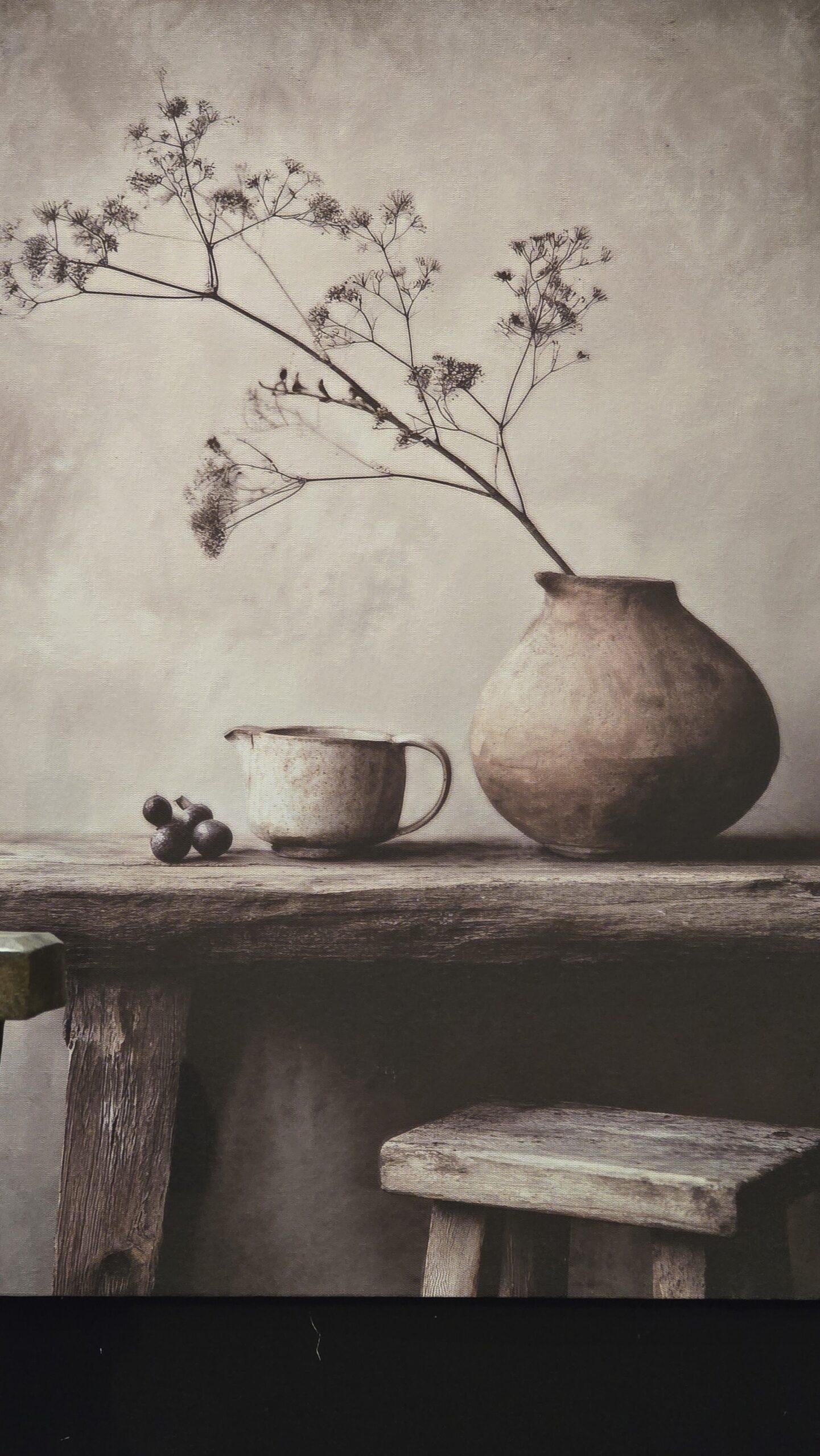 Dit canvas schilderij 50×40 is een sfeervolle wanddecoratie in landelijke stijl met een rustig stilleven van kruik en tak op een houten tafel. De zachte kleuren en natuurlijke uitstraling zorgen voor warmte en rust in huis.