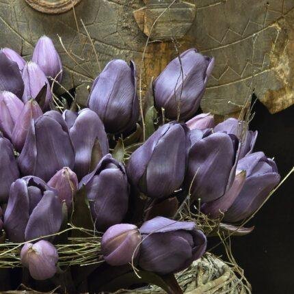 Met de Enkele tulp donker paars donker blad haal je niet alleen een decoratief element in huis, maar ook een blijvende herinnering aan de pracht van het voorjaar. Ervaar de magie van bloemen, ongeacht het seizoen, en laat je omringen door de tijdloze schoonheid van deze kunstige creaties.