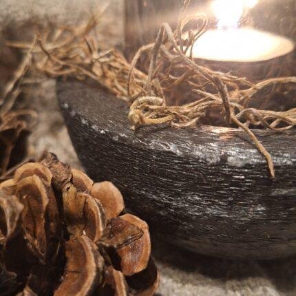 Je zet het samen met andere decoratie op een dienblad en decoreert het met mos en dennenappels.