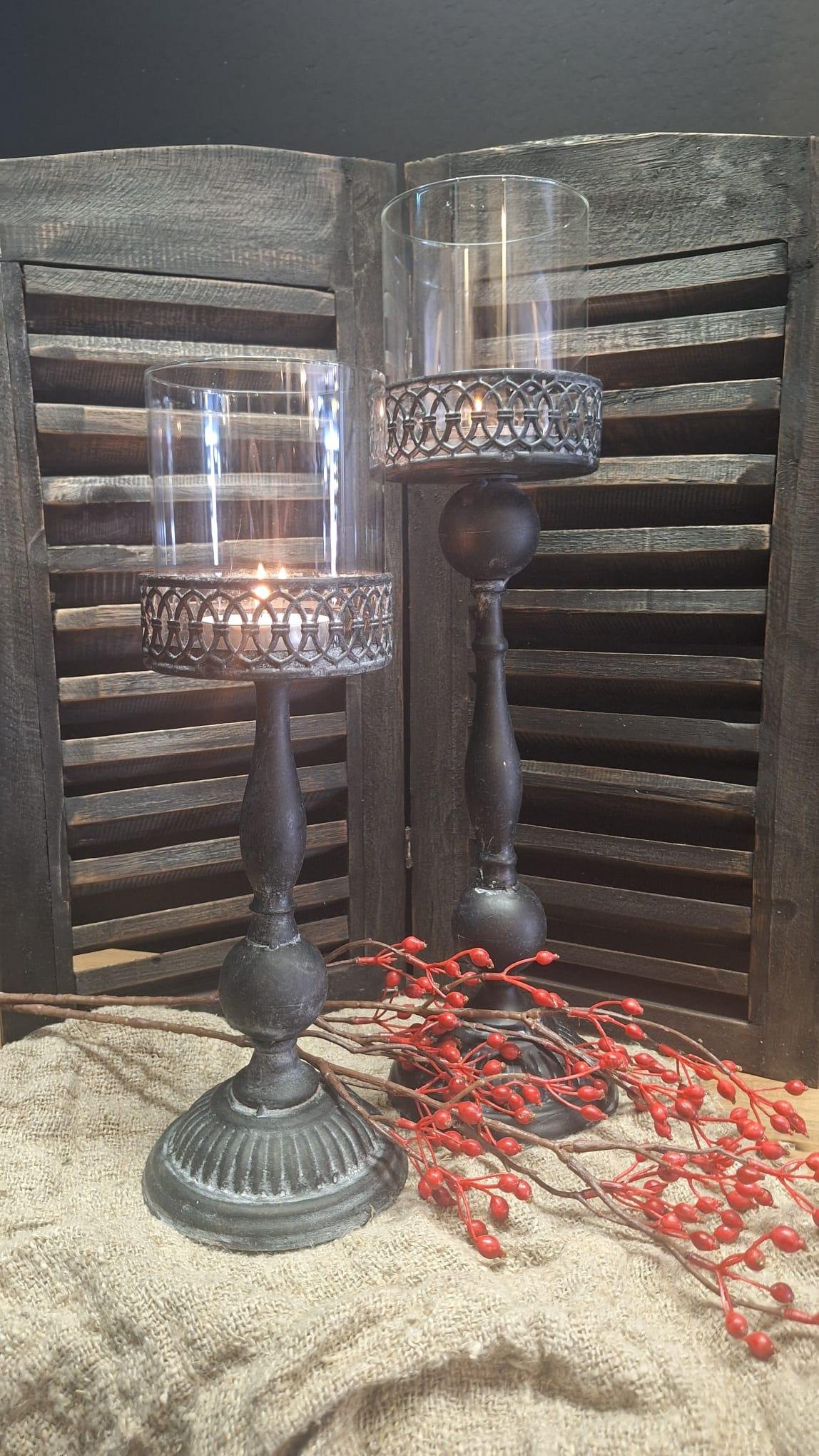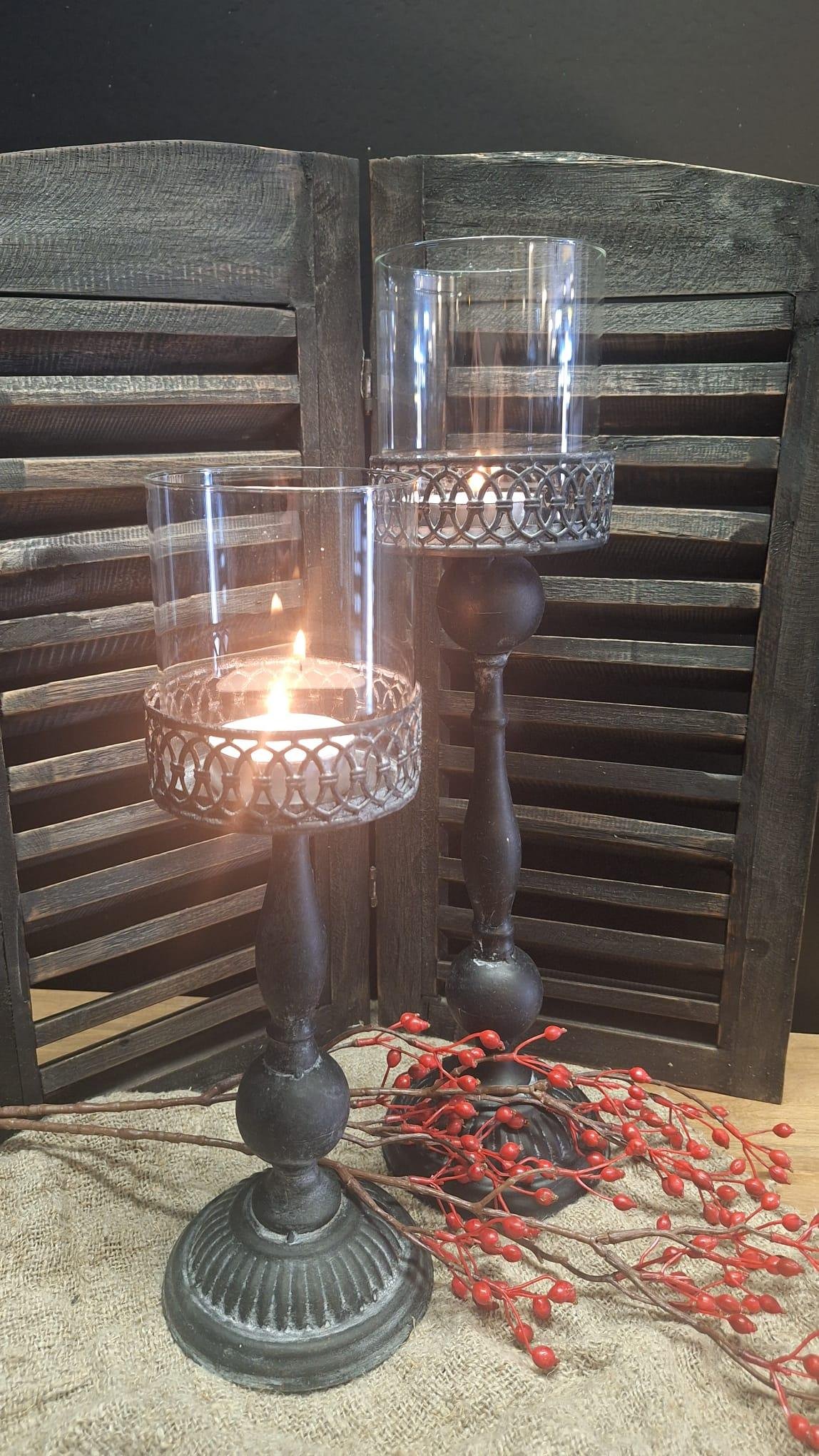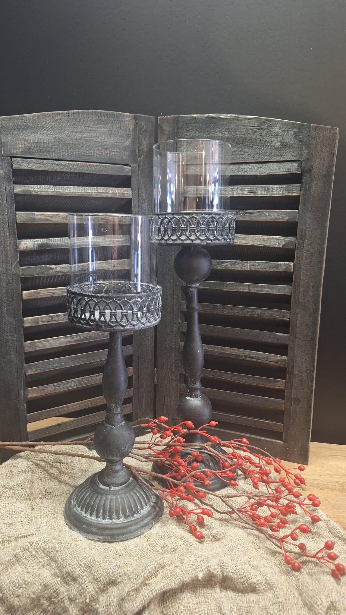 Stijlvolle grijze kandelaar met glas in landelijke stijl. Perfect voor stompkaarsen, geeft een warme en sfeervolle uitstraling.