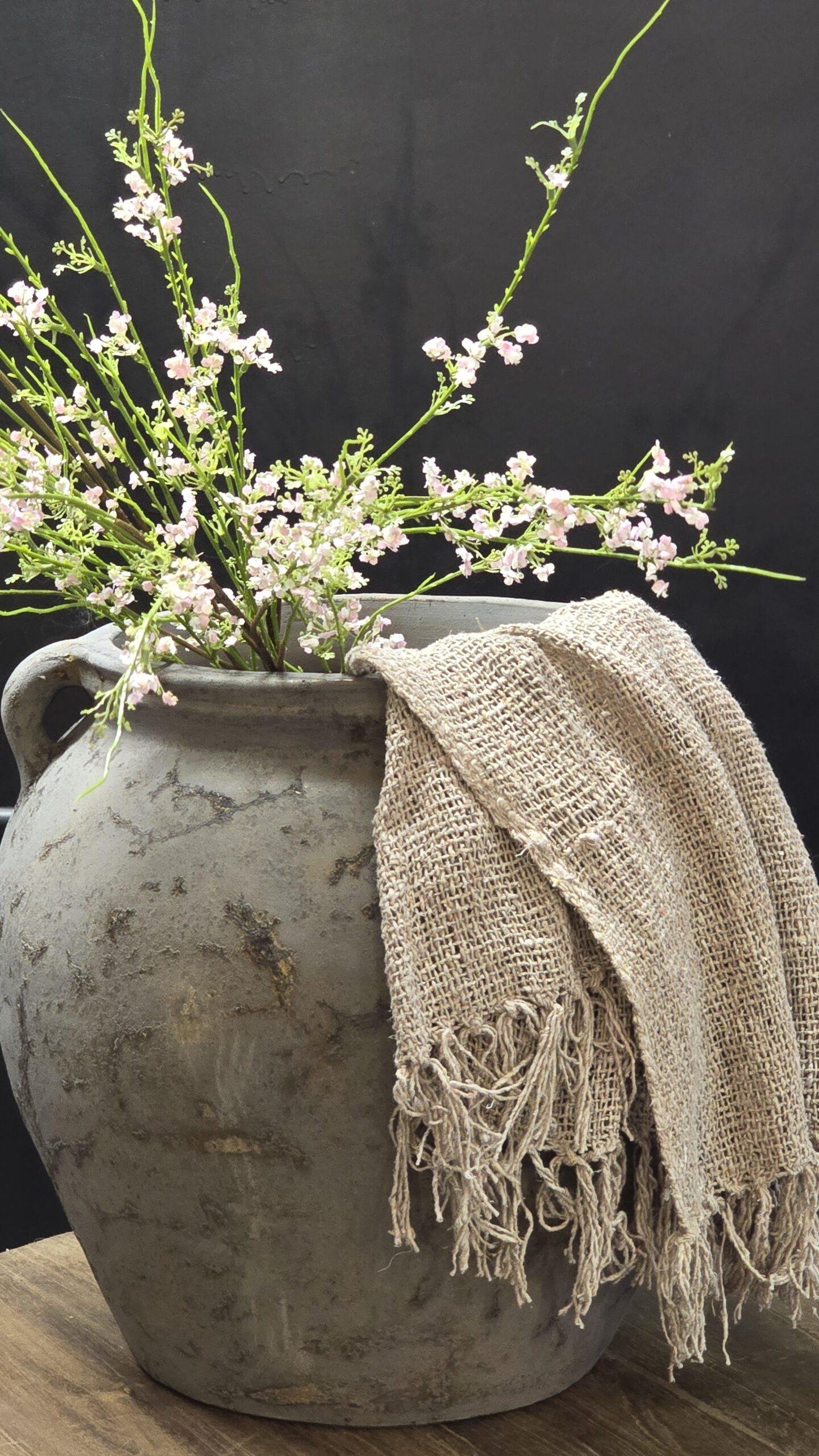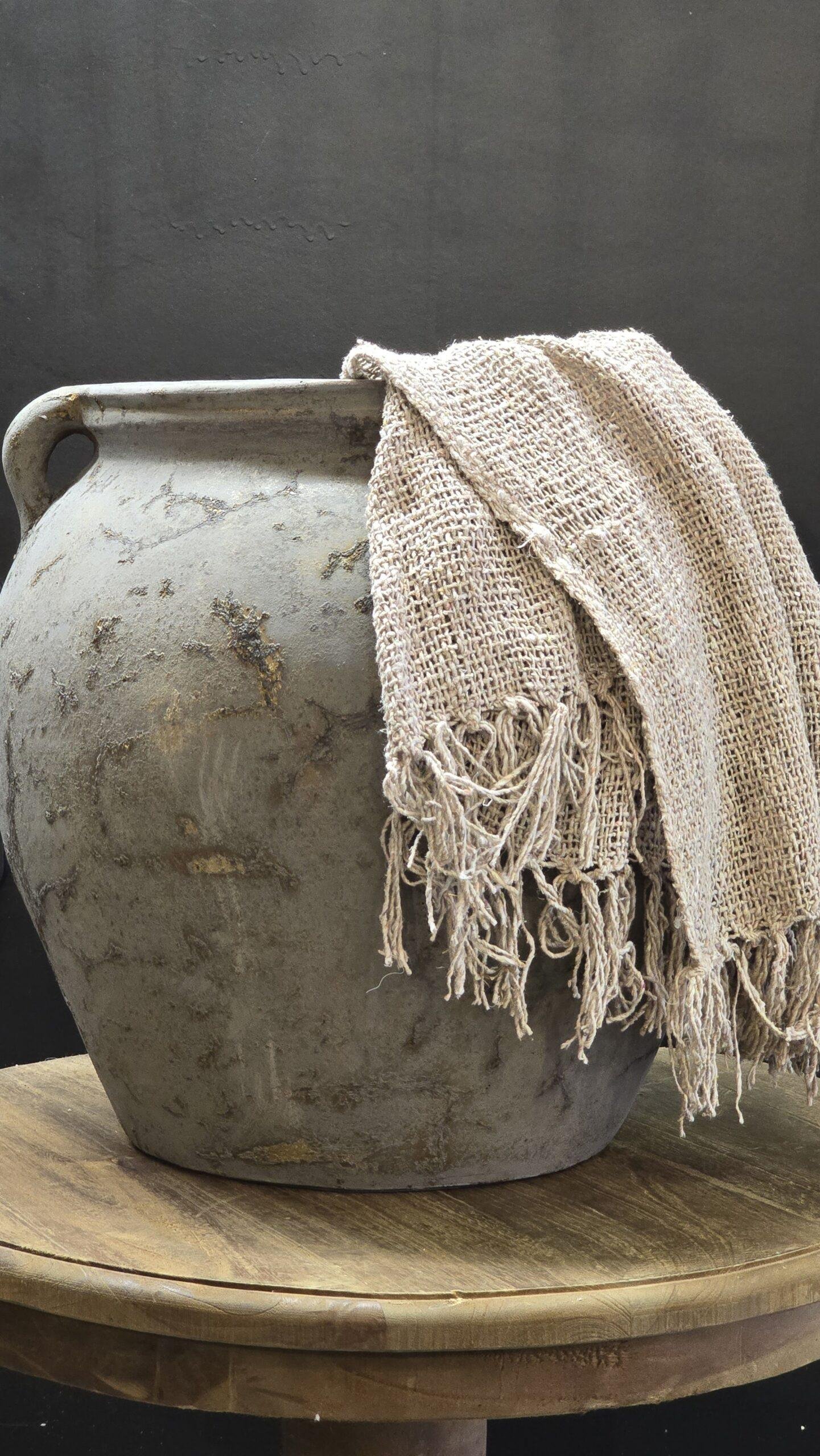 De grote grijze kruik met oren is een echte blikvanger in een landelijk en sober interieur. Door het formaat en de vergrijsde afwerking valt hij direct op, zonder dat het te druk wordt. Precies die rustige, stoere uitstraling waar veel mensen naar zoeken.
