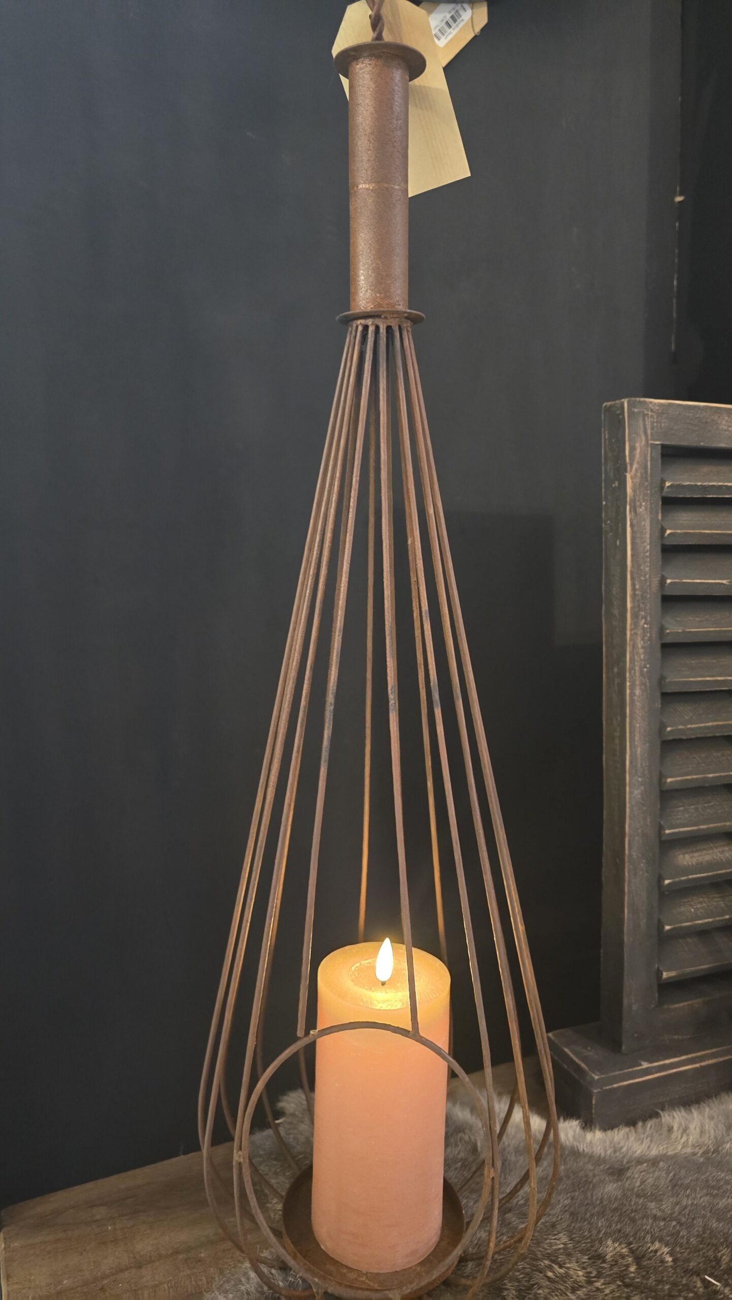 De roestige garde is perfect te combineren met een stompkaars. Plaats hem op een buitentafel, op de grond tussen je potten, of op een houten trapje voor een speels effect. Zodra het begint te schemeren, zorgt de kaars voor een warm en uitnodigend licht.
