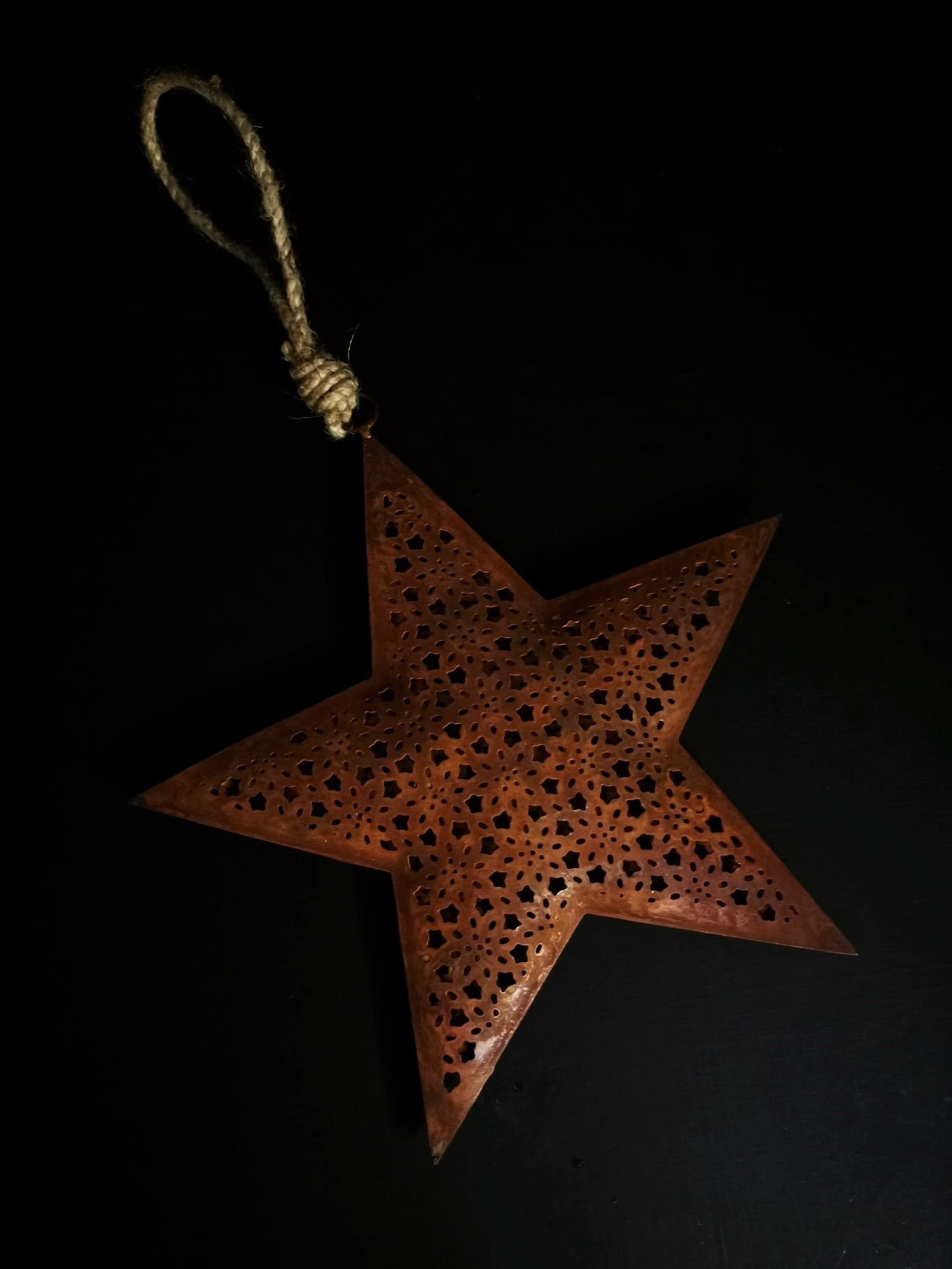 De metalen ster heeft een afmeting van 20x20x2.5cm + 15cm touw