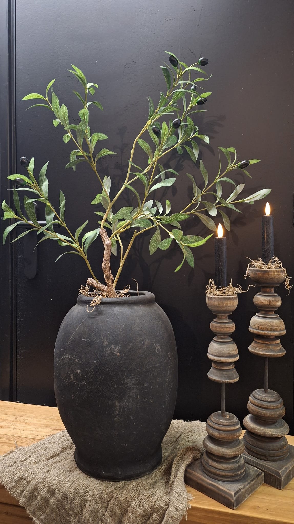 De olijfboom wordt geleverd zonder pot of decoratie, zodat je hem geheel naar eigen wens kunt combineren. Plaats hem bijvoorbeeld in een robuuste kruik, een houten schaal of een stenen vaas voor een stoer accent in de woonkamer of keuken. Door het natuurlijke karakter van de olijfboom sluit hij perfect aan bij rustieke materialen zoals jute, hout, beton en linnen.
