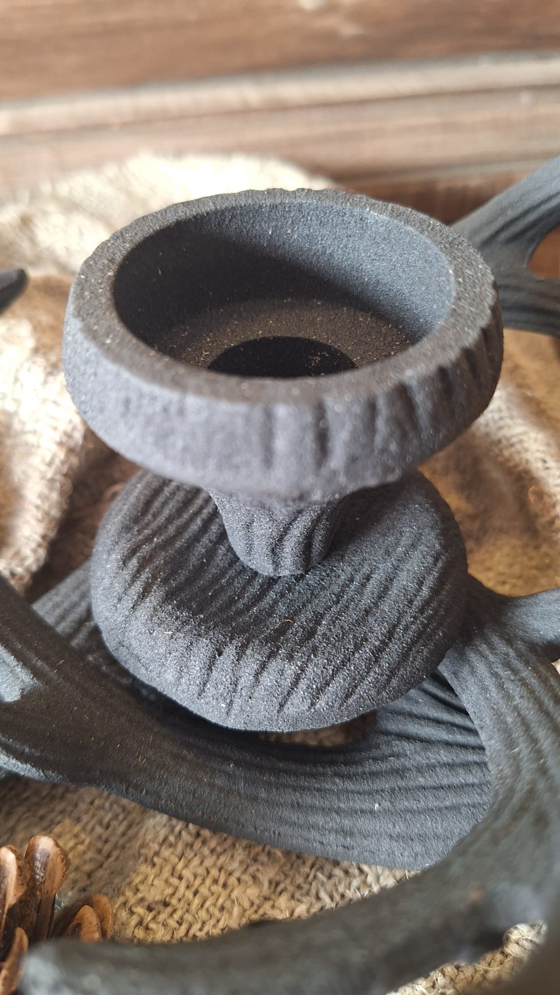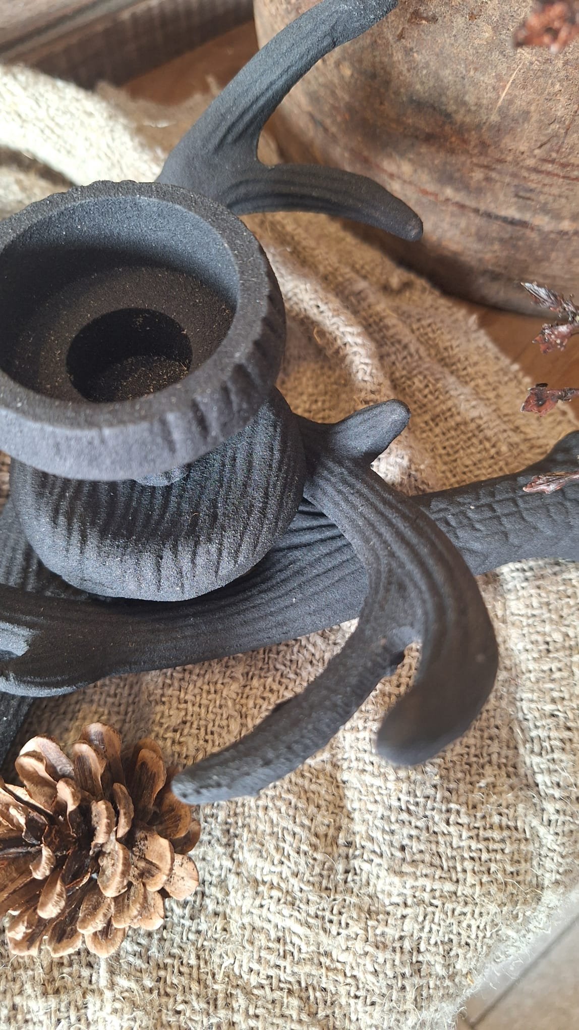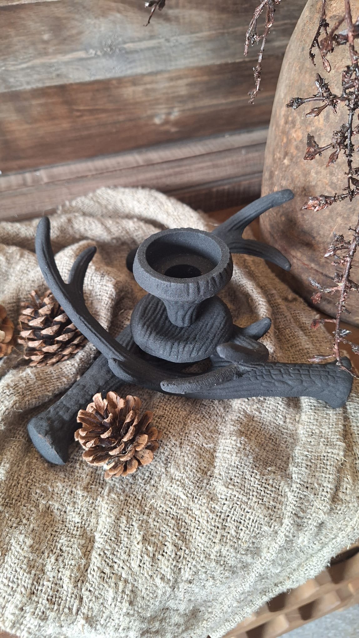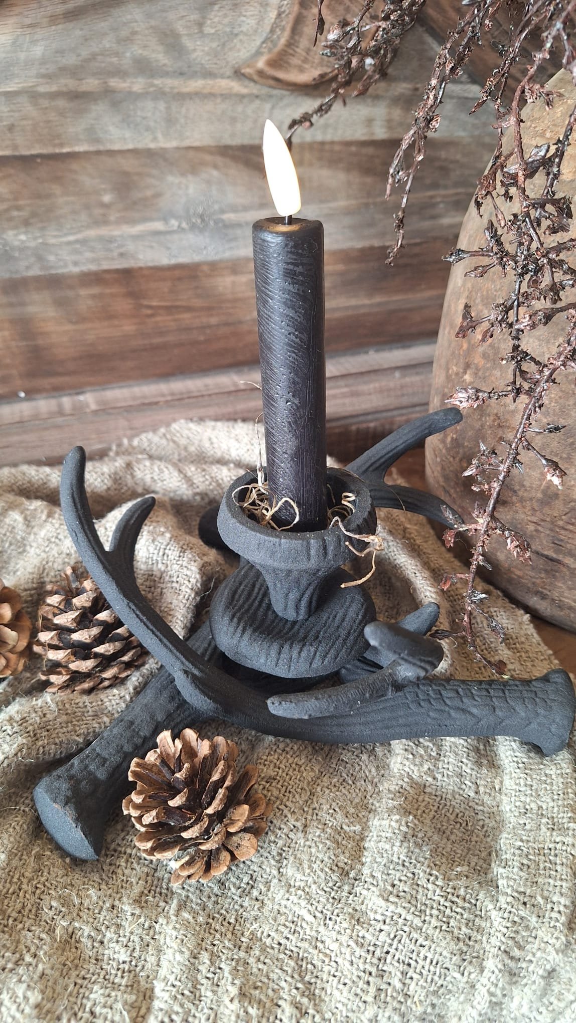 Deze kandelaar zwart hertengewei komt het best tot zijn recht in een sobere, landelijke setting — bijvoorbeeld met mos, gedroogde takjes of dennenappels. Hij brengt sfeer in elk seizoen, van herfst tot kerst.