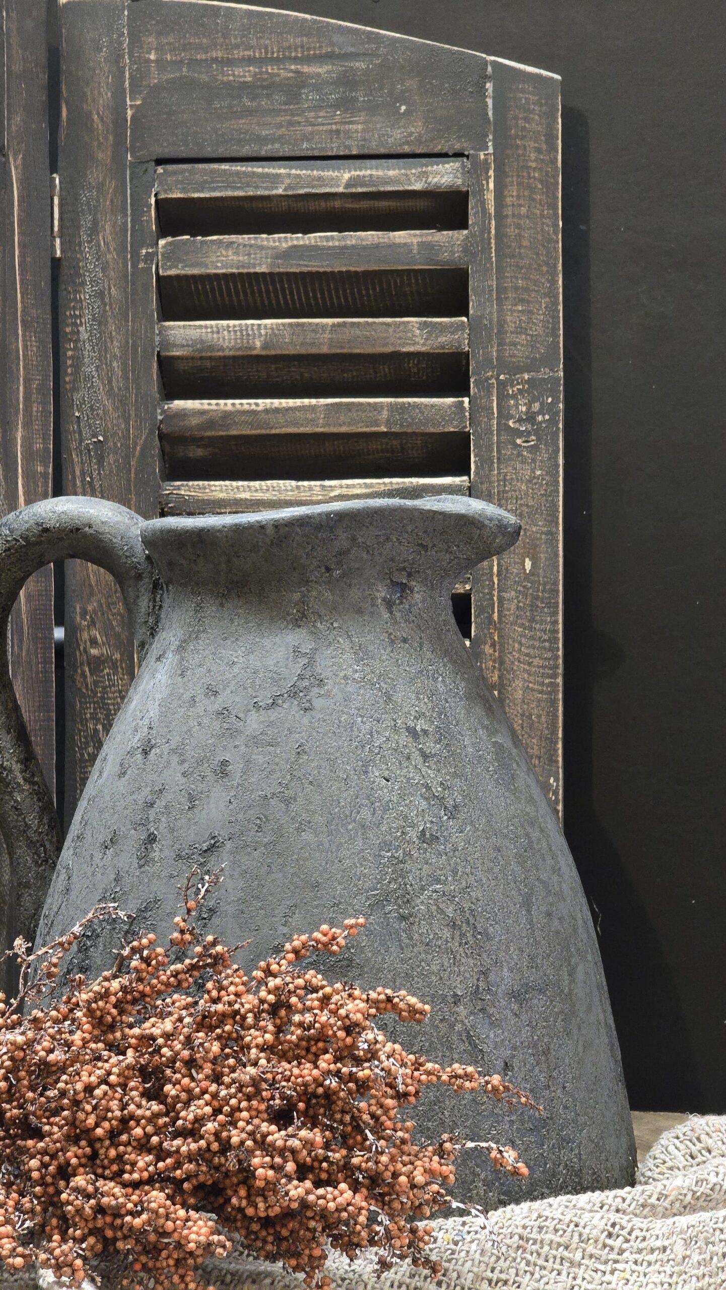 Stoere landelijke kruik met oor in grijze tint. Robuust en sfeervol item voor een rustig en warm interieur.