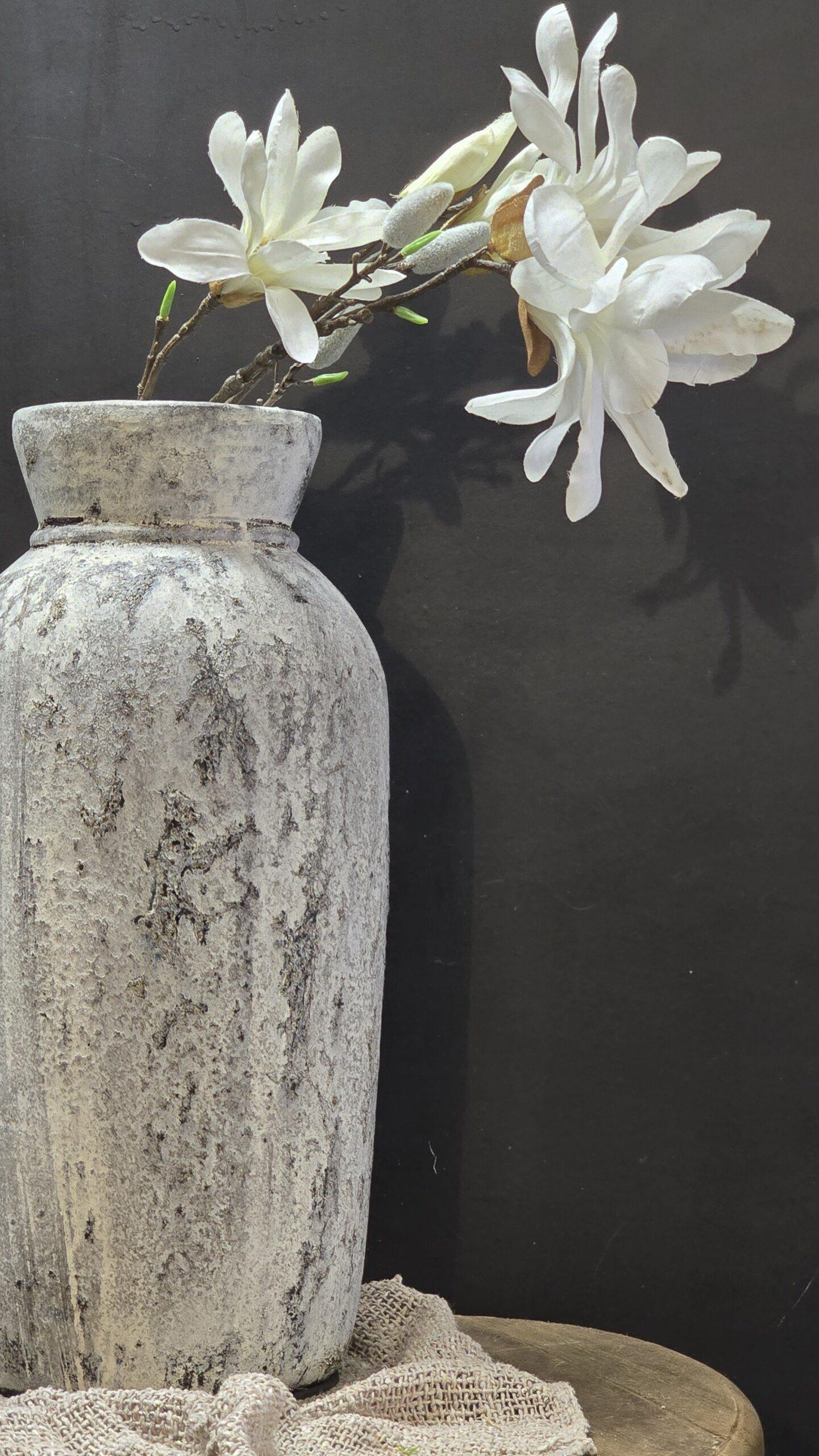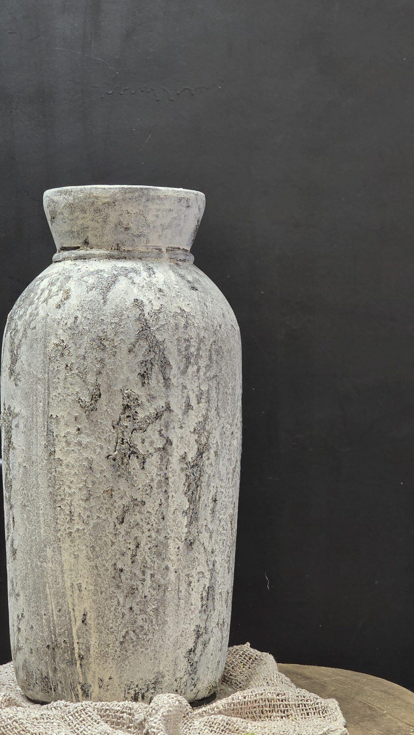 Landelijke vaas crème grijs hoog – stoere kruik pot sober