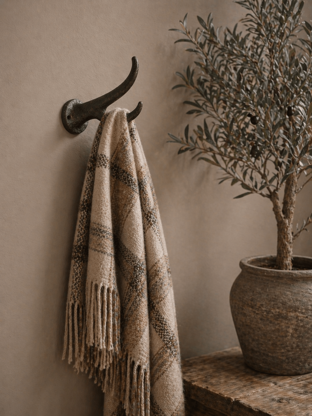 Gebruik deze wandhaak om een mooie plaid op te hangen, zoals op de foto, of voor een jas, tas of keukentextiel. In de hal, woonkamer of zelfs in de badkamer komt hij overal tot zijn recht. Combineer meerdere haken naast elkaar voor een speels en praktisch effect.