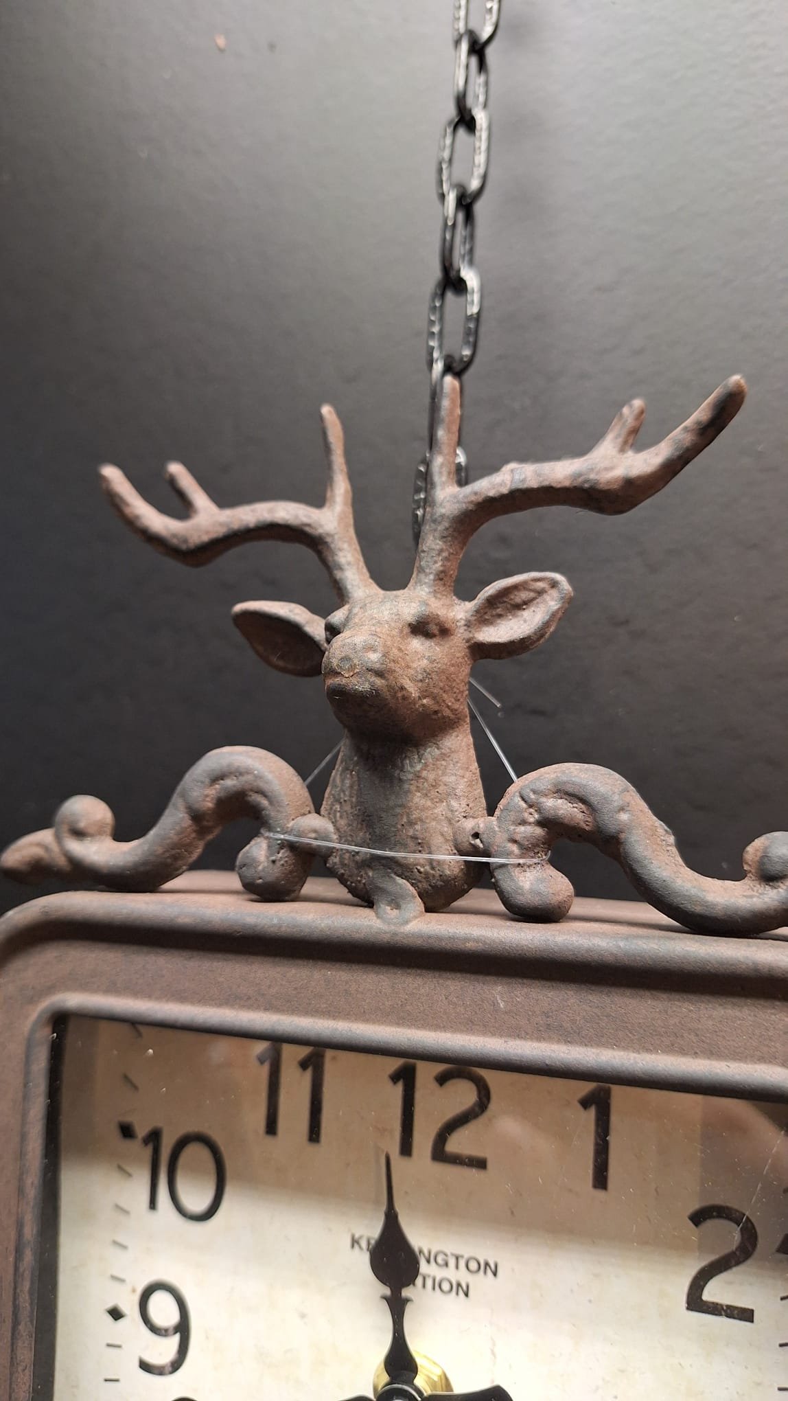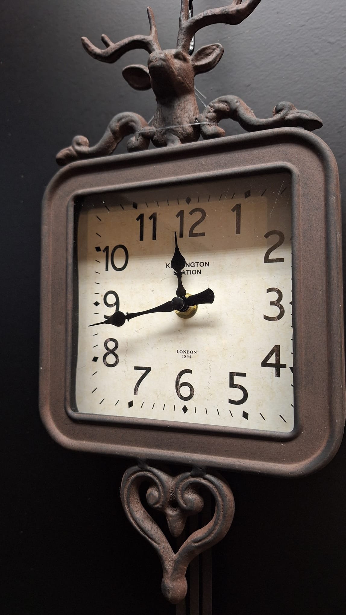 De sierlijke pendule beweegt subtiel, wat zorgt voor een speels detail. Boven de klok troont een imposante hertenkop, die deze klok direct tot een statement piece maakt. Of je hem nu in de woonkamer, hal of keuken hangt – deze wandklok straalt warmte en elegantie uit.