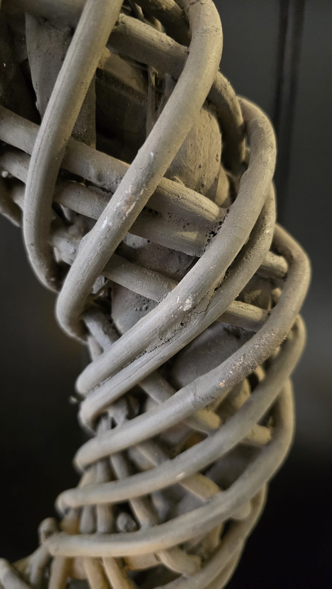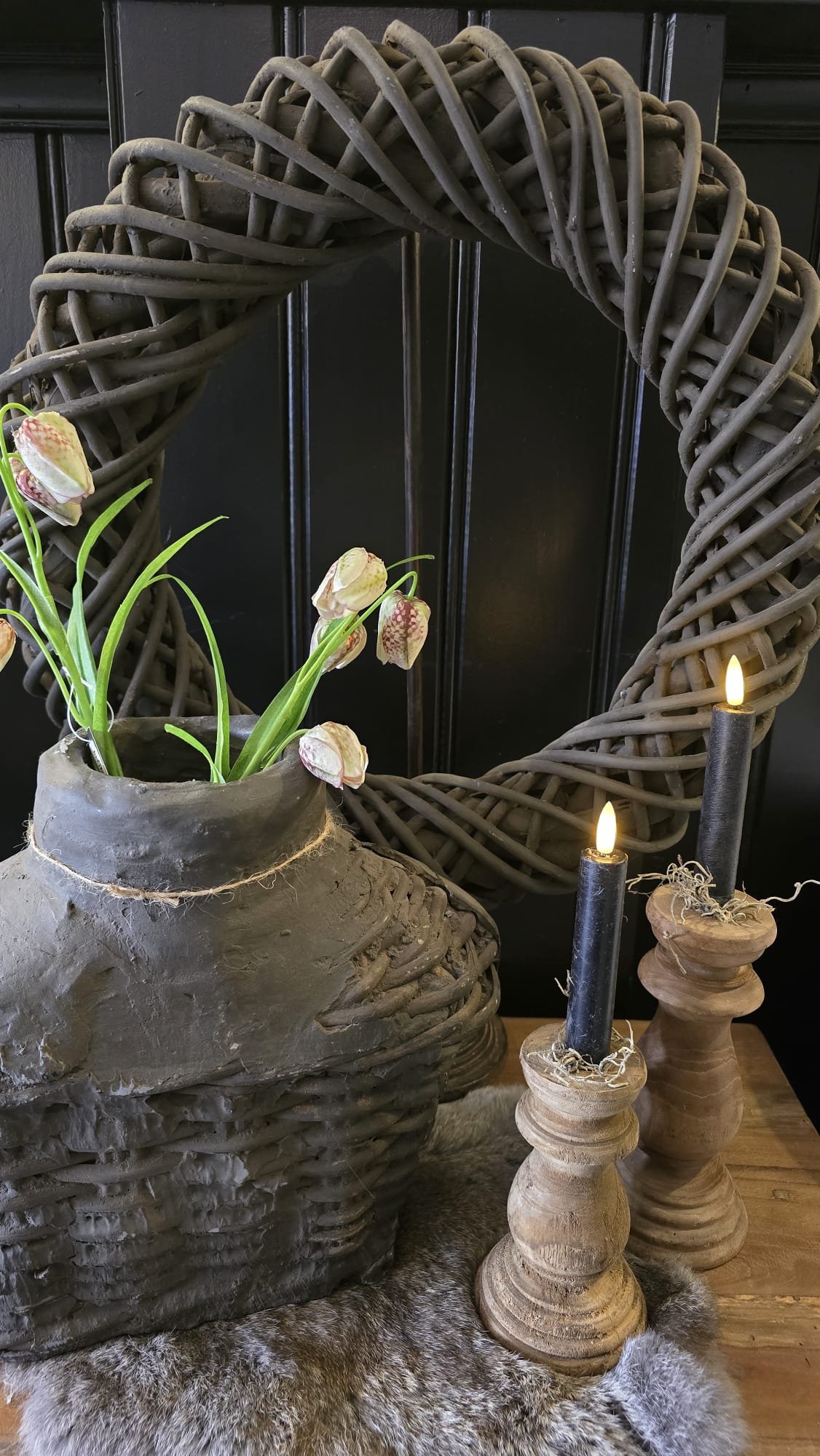 Deze stijlvolle grijze krans is handgemaakt en uniek in zijn afwerking. De matte, doorleefde leemstructuur zorgt voor een authentiek en tijdloos accent aan elke ruimte.