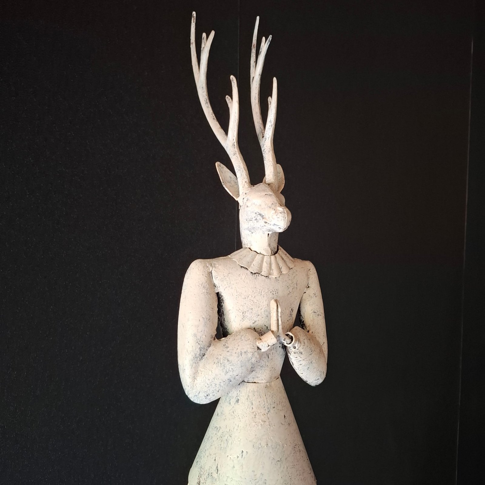 Het hert is gemaakt van duurzaam metaal, dat zorgvuldig is vormgegeven om een verfijnde en gedetailleerde uitstraling te creëren. Onder de draadmetalen rok is een ruimte waarin de kaars kan worden geplaatst. Het metaal is afgewerkt in een mooie vintage creme kleur, waardoor het gemakkelijk te combineren is met verschillende interieurstijlen.