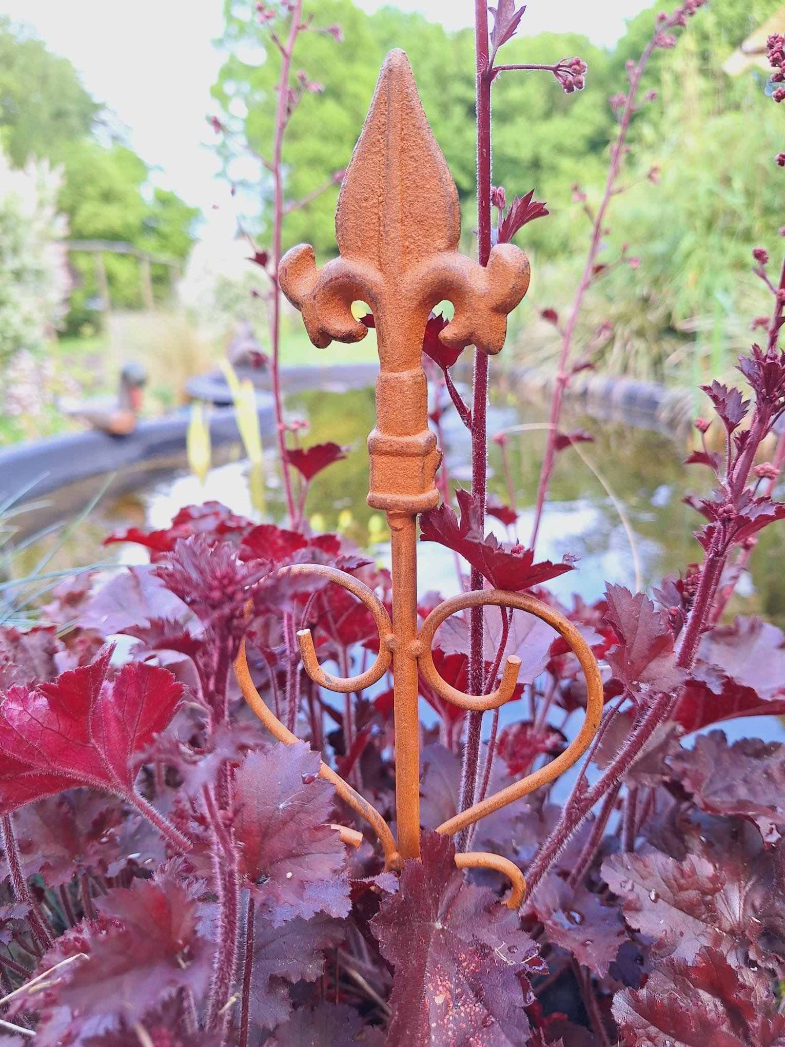 Een van die opvallende accenten is de roestige metalen tuinsteker met ornamenten. Deze stoere figuren voegen een vleugje romantiek toe aan de landelijke omgeving.