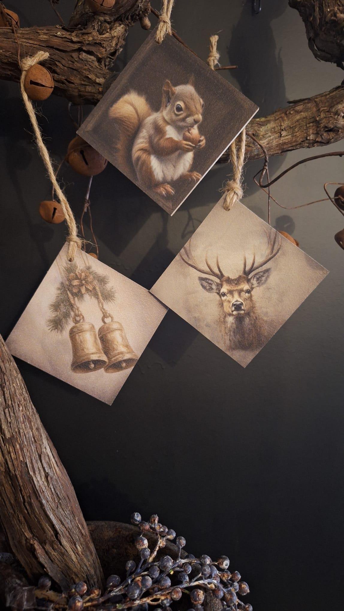 Sfeervolle Mini deco hanger de Klokken op MDF, bedrukt met UV-bestendige inkt. Landelijke decoratie met goudkleurige bellen, dieren, dennenappels etc.