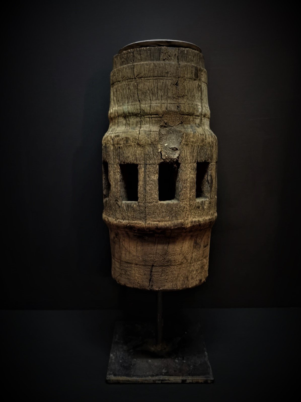 Deze oude houten wielas kandelaar op statief is een echte blikvanger voor liefhebbers van stoer en sober wonen. De kandelaar is gemaakt van een originele, gebruikte houten wielas, die is omgebouwd tot sfeervolle kandelaar. Geplaatst op een stevig metalen statief krijgt dit object een krachtige uitstraling.