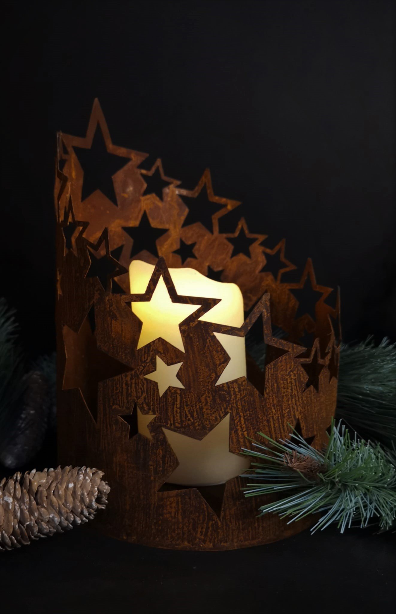 Het roestkleur windlicht heeft een hoogte van ca 30cm