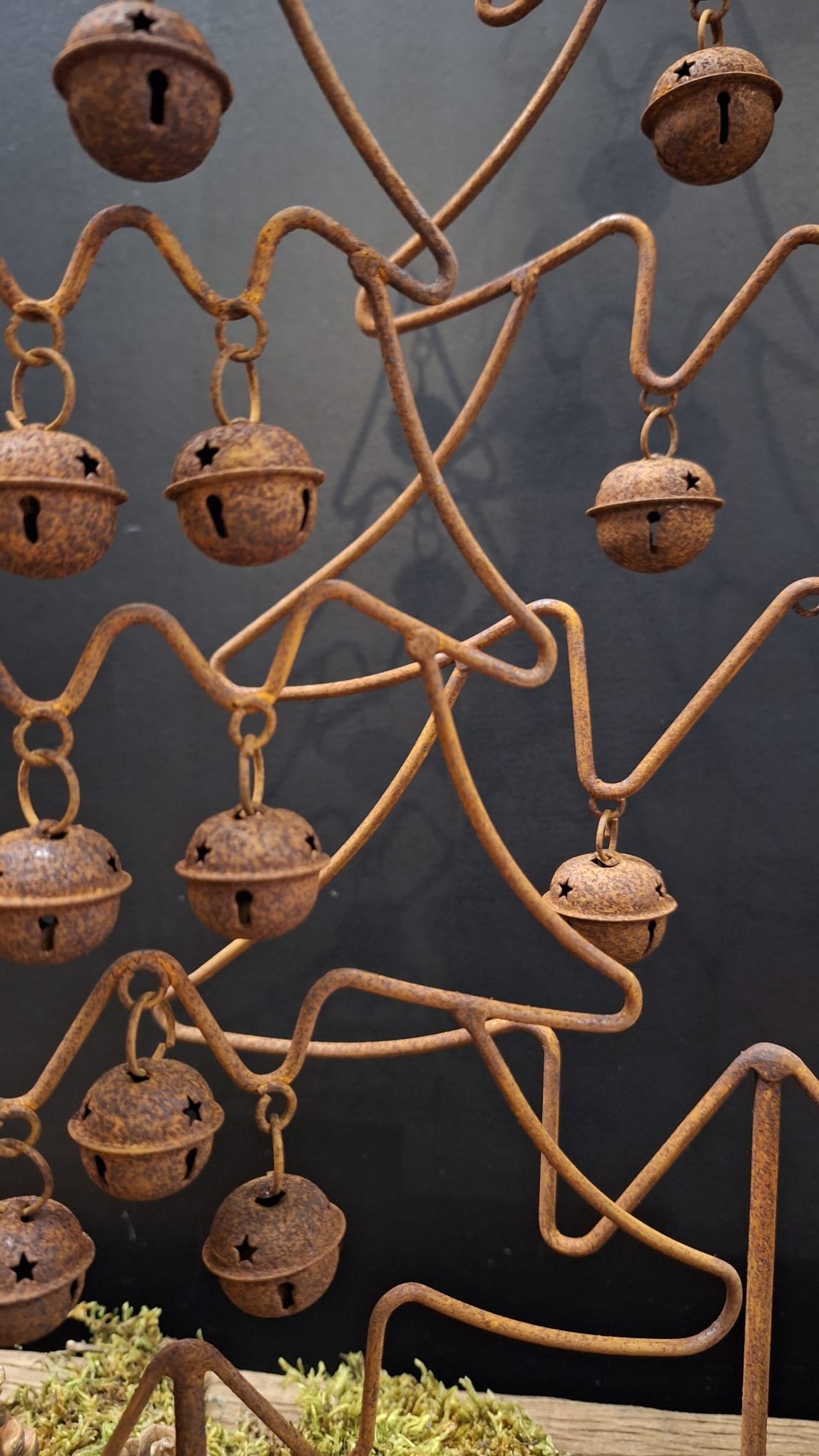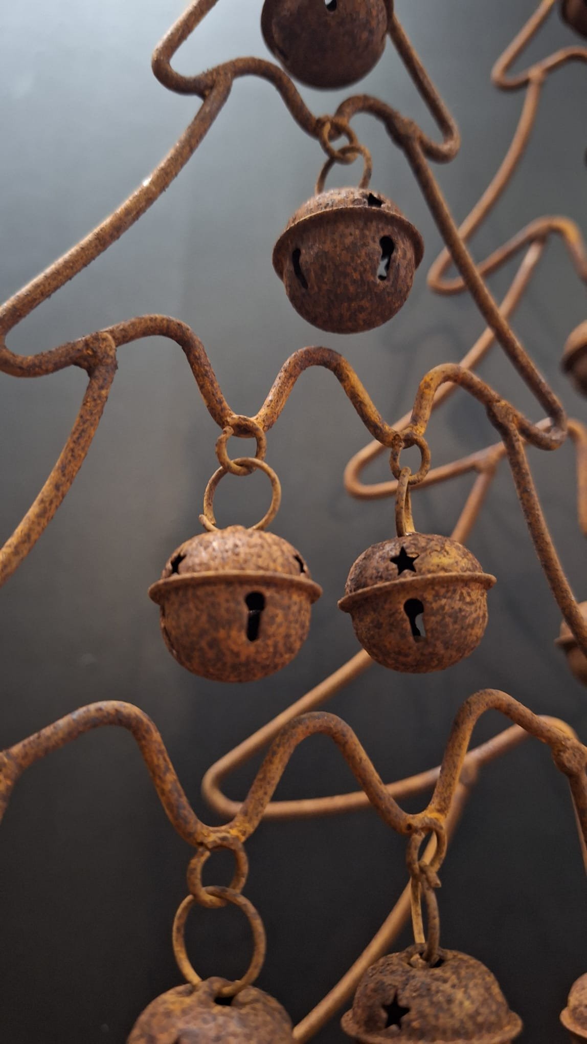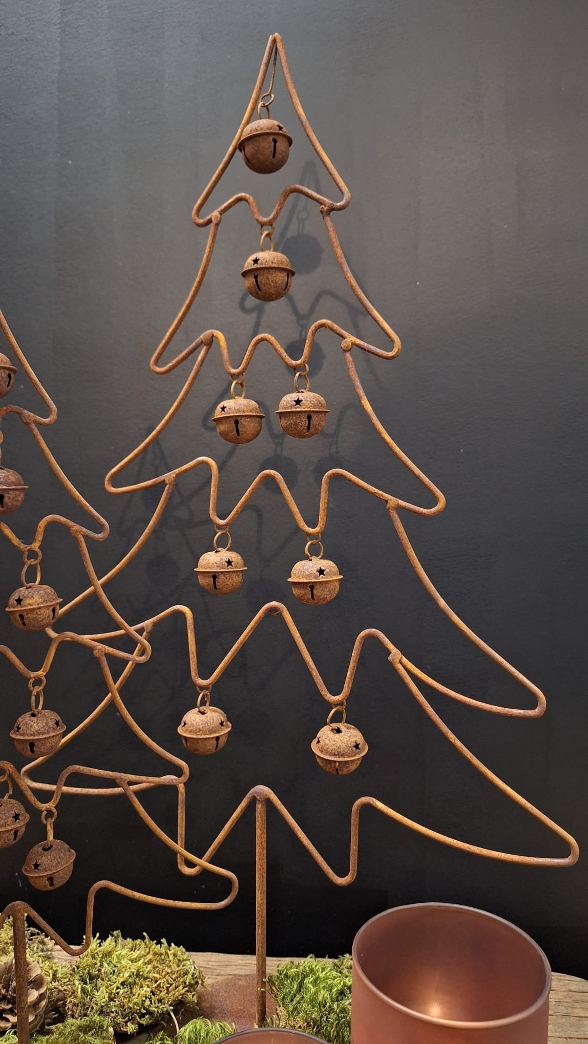 Deze roest dennenboom met bellen is een absolute sfeermaker voor wie houdt van een landelijke, sobere kerst. Het metalen frame is gevormd tot een abstracte dennenboom en afgewerkt met een warme roestkleur. Aan de boom hangen meerdere belletjes, elk met een stervormige uitsnijding. Dit geeft een speels en toch ingetogen effect dat perfect past binnen een stoer en sober interieur.