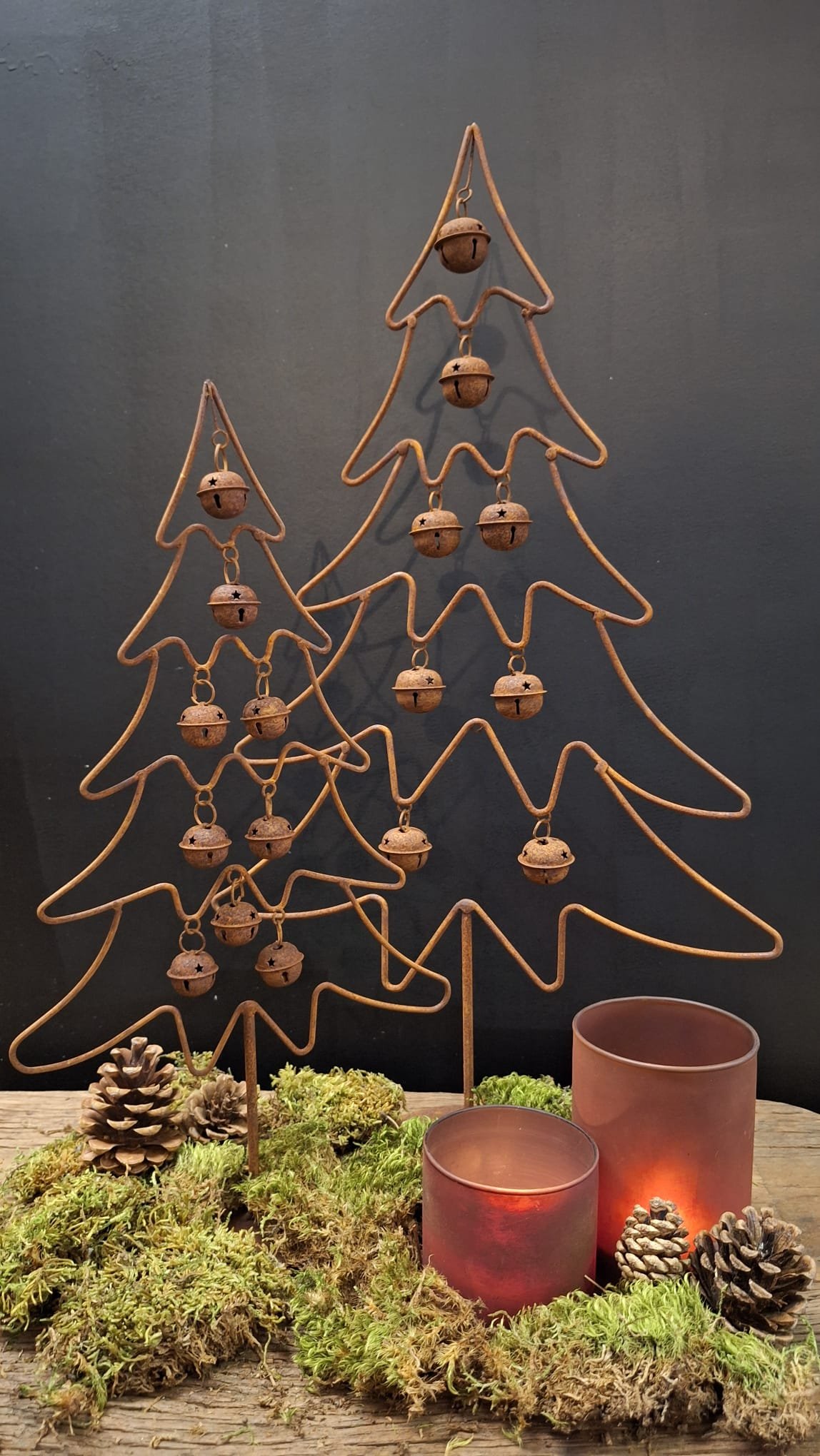 Roestige dennenboom met bellen – 40 en 56 cm