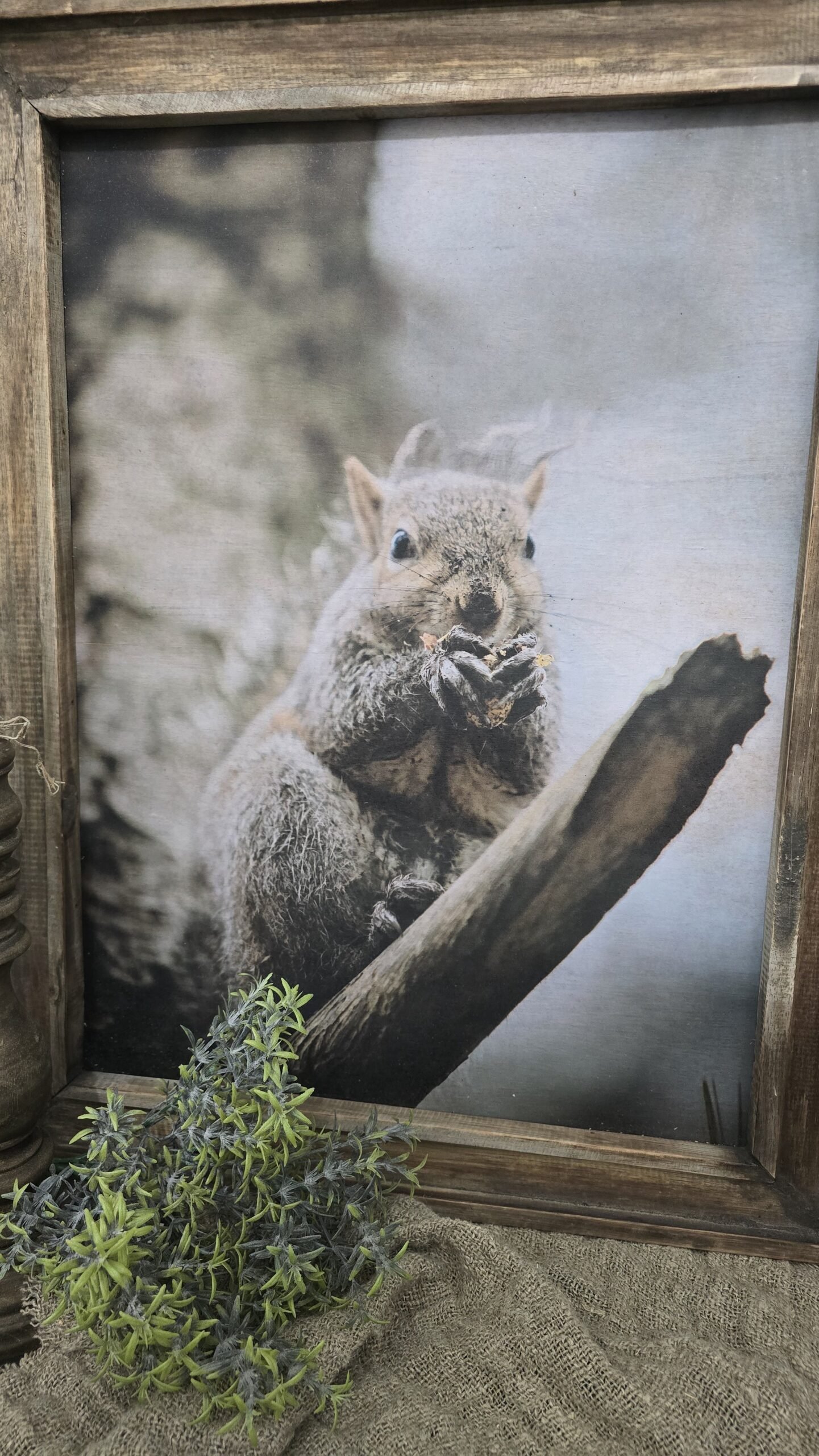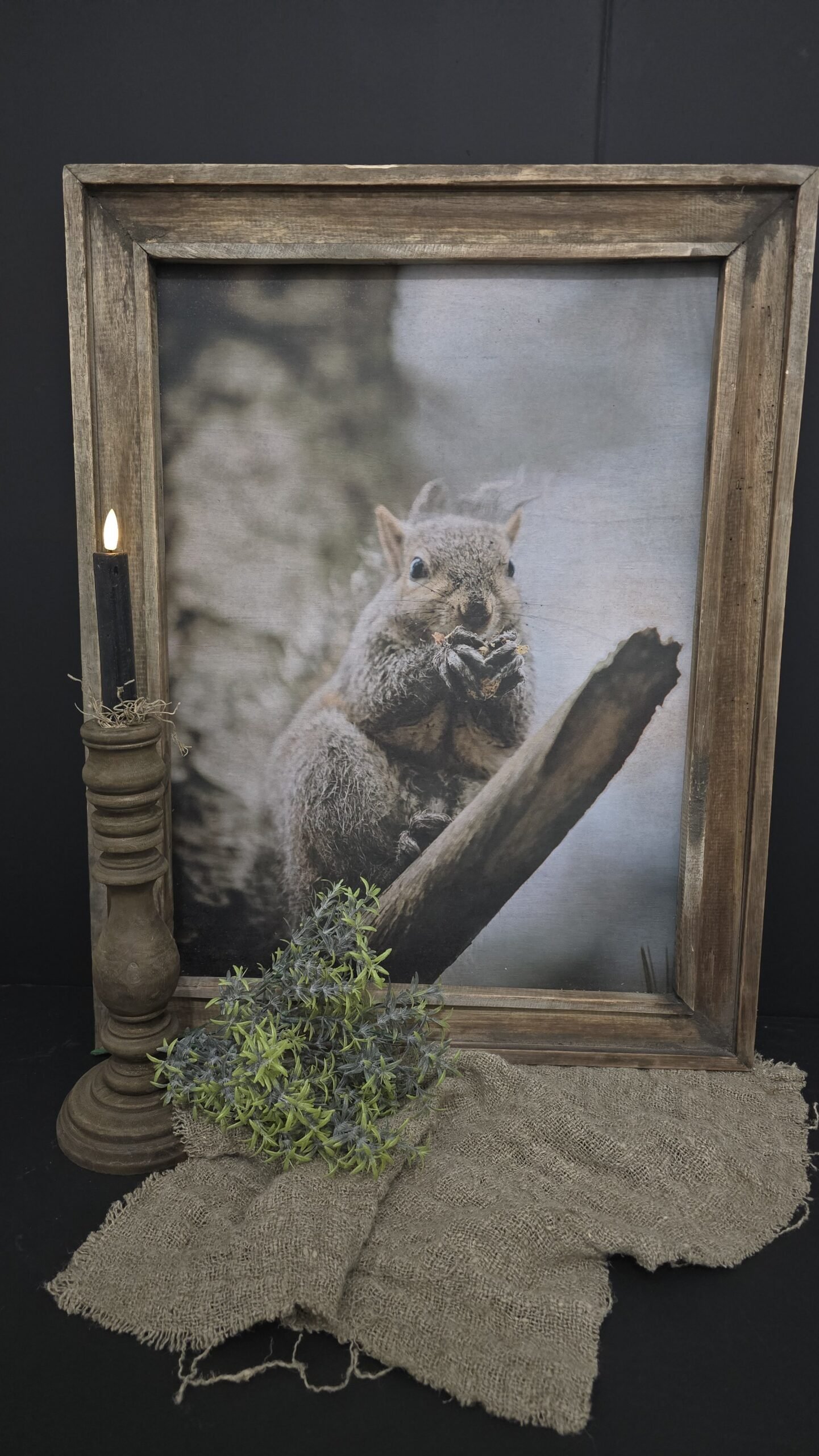Breng rust en natuurlijke charme in je interieur met dit prachtige Schilderij eekhoorn met houten frame M