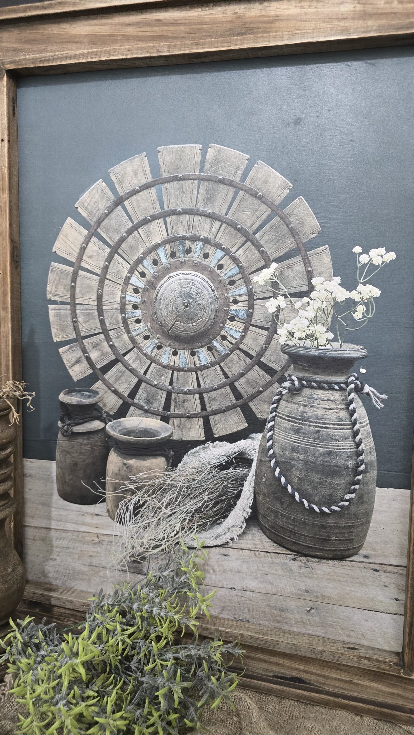 Breng rust en natuurlijke charme in je interieur met dit prachtige Schilderij spinnenwiel met houten frame XL