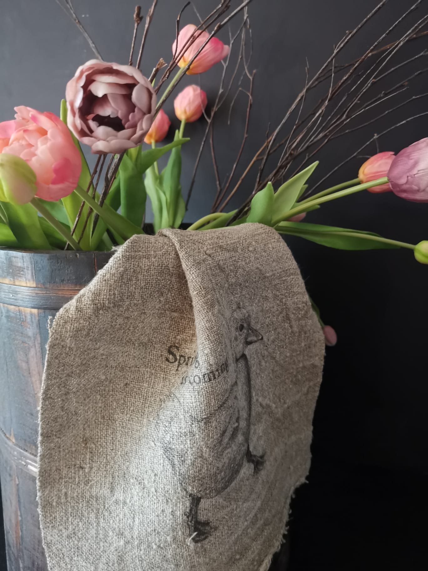 Het decoratieve linnen Shabby doekje lente eend heeft een afmeting van 30×45 cm is een charmante toevoeging aan elke landelijke woonstijl. Met zijn voorjaarsprint, gedrukt in levendige kleuren of elegante zwarte inkt, brengt dit kunstwerk een vleugje frisheid en warmte in je interieur.