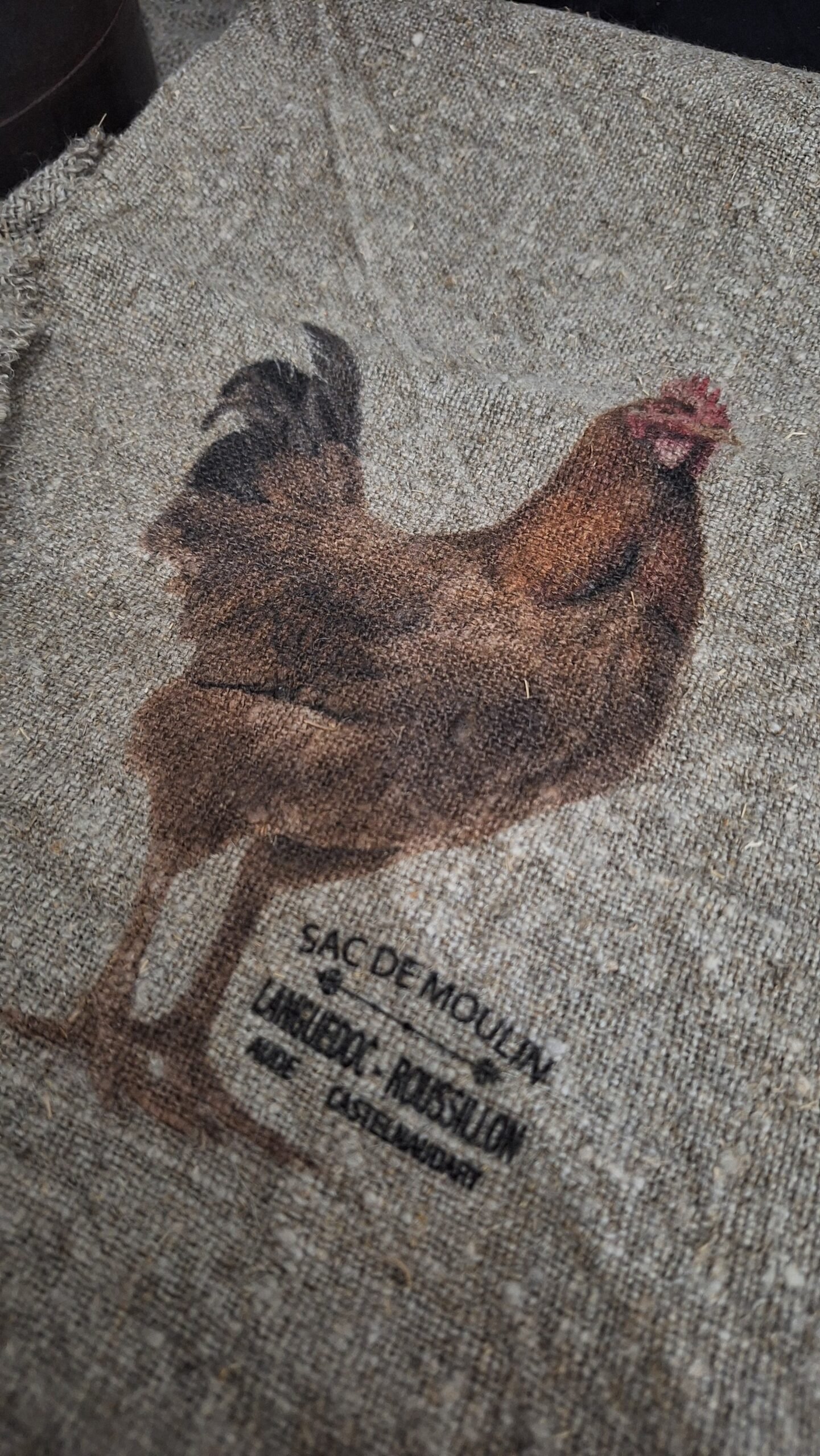 Met een afmeting van 30×45 cm en een onafgezoomde afwerking behoudt het doek zijn authentieke en doorleefde uitstraling. Eén zijde is subtiel voorzien van rafels, terwijl de lange zijde in het midden bedrukt is met een landelijke opdruk.