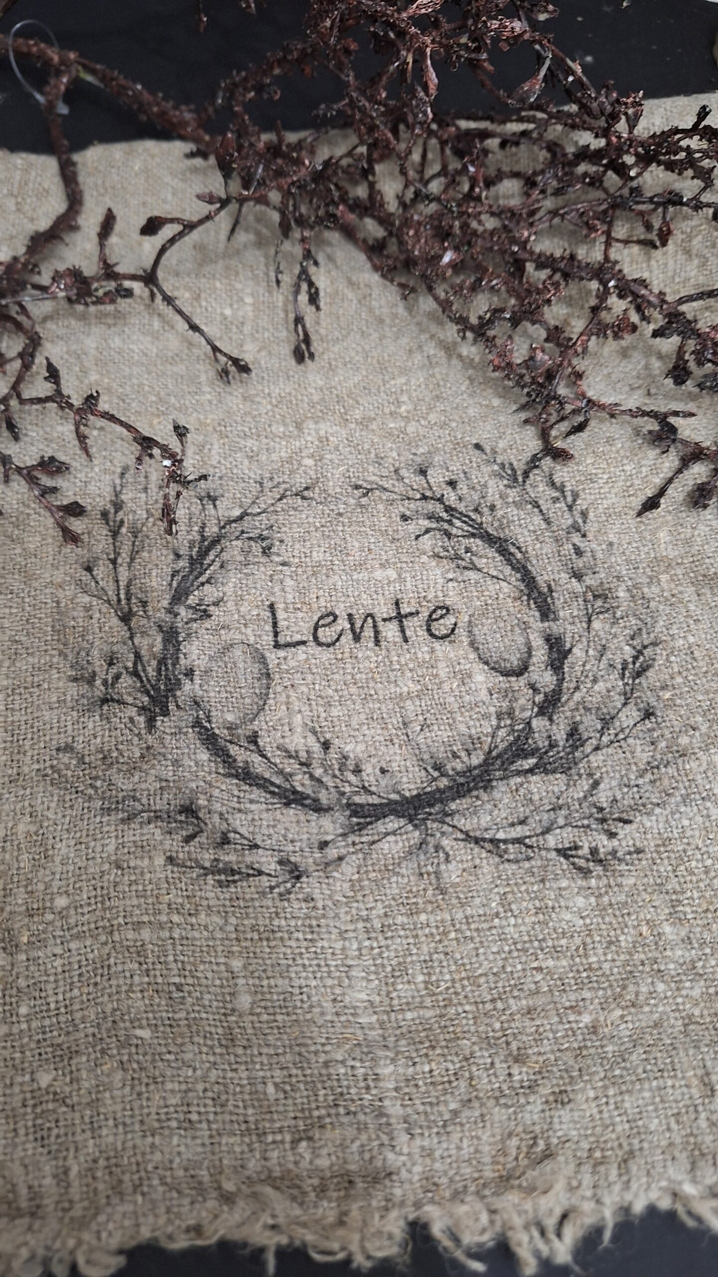Met een afmeting van 30×45 cm en een onafgezoomde afwerking behoudt het doek zijn authentieke en doorleefde uitstraling. Eén zijde is subtiel voorzien van rafels, terwijl de lange zijde in het midden bedrukt is met een landelijke opdruk.