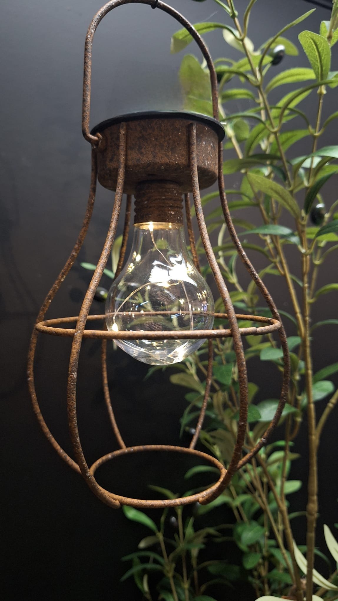 Stoere solar hanglamp in roestkleurig metaal. Ideaal voor een landelijke of sobere tuin, terras of balkon.