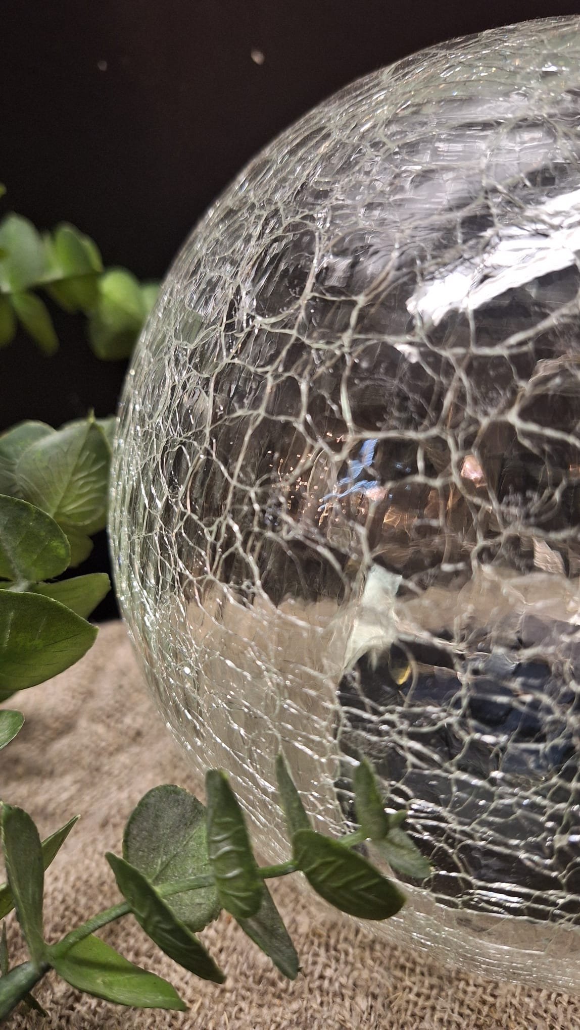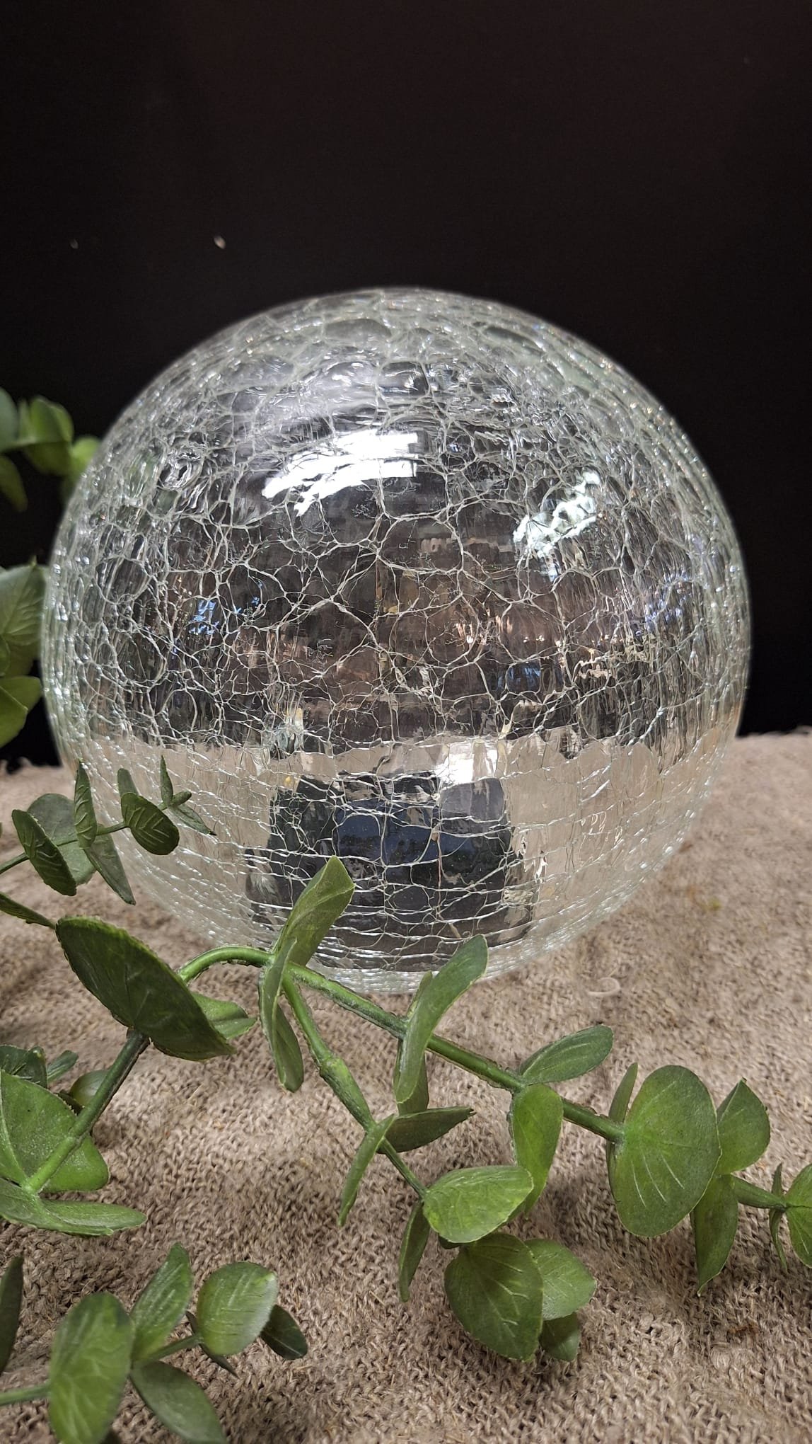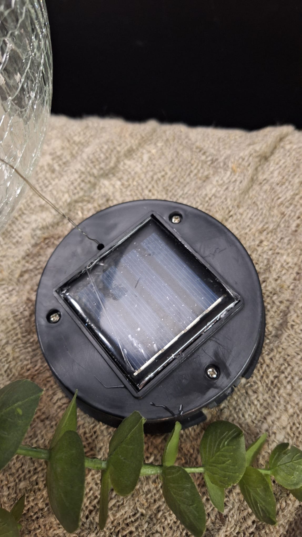 Glazen solar lichtbol met craquelé effect, ideaal voor in de tuin of op het terras. Laadt overdag op en straalt ’s avonds warm licht uit. Prachtige landelijke sfeer!