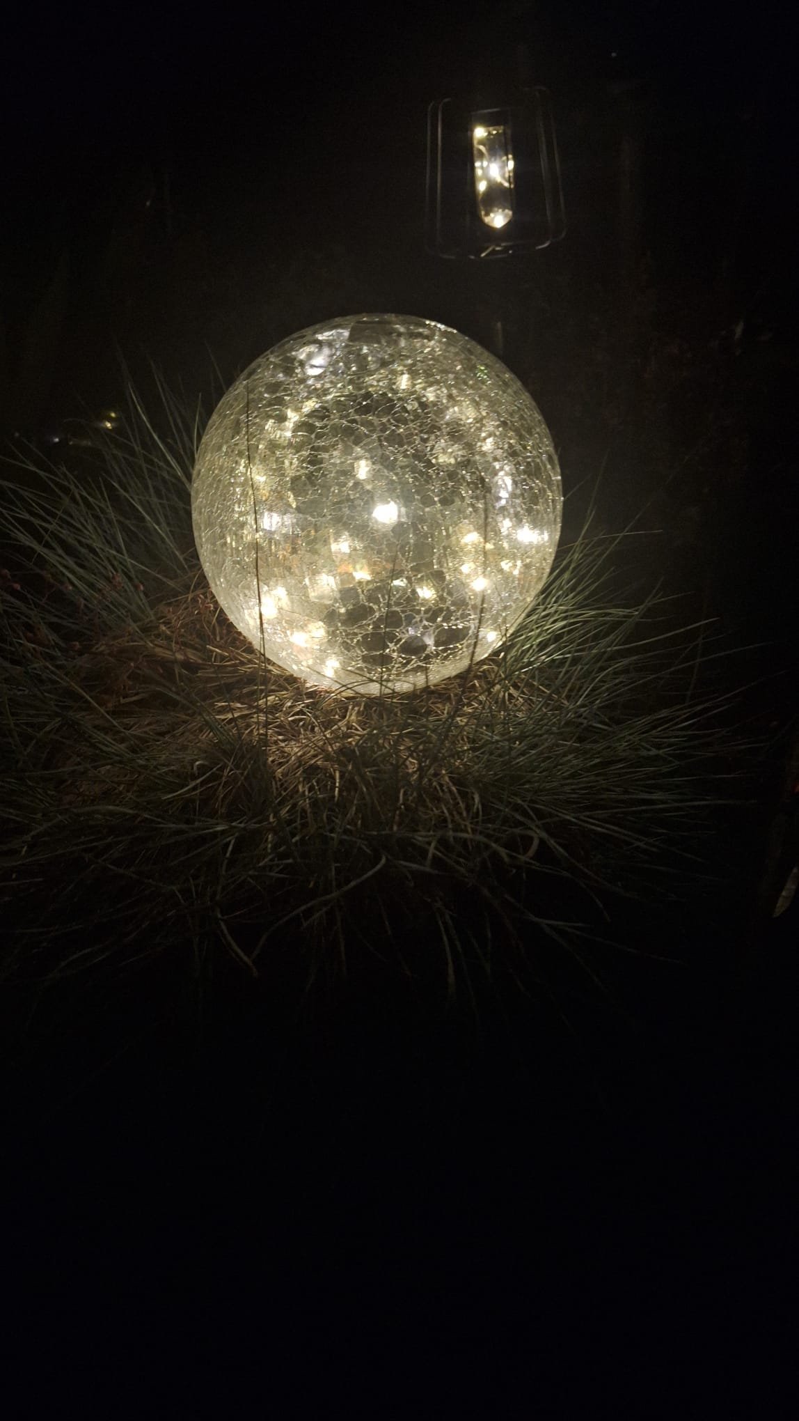 De lichtbol is gemaakt van dik glas met een stijlvolle breukstructuur en is voorzien van LED-verlichting. Geen stroom nodig, geen gedoe – alleen sfeer. Deze glazen bol straalt een warme gloed uit zodra het donker wordt, en draagt bij aan een gezellige, landelijke ambiance.