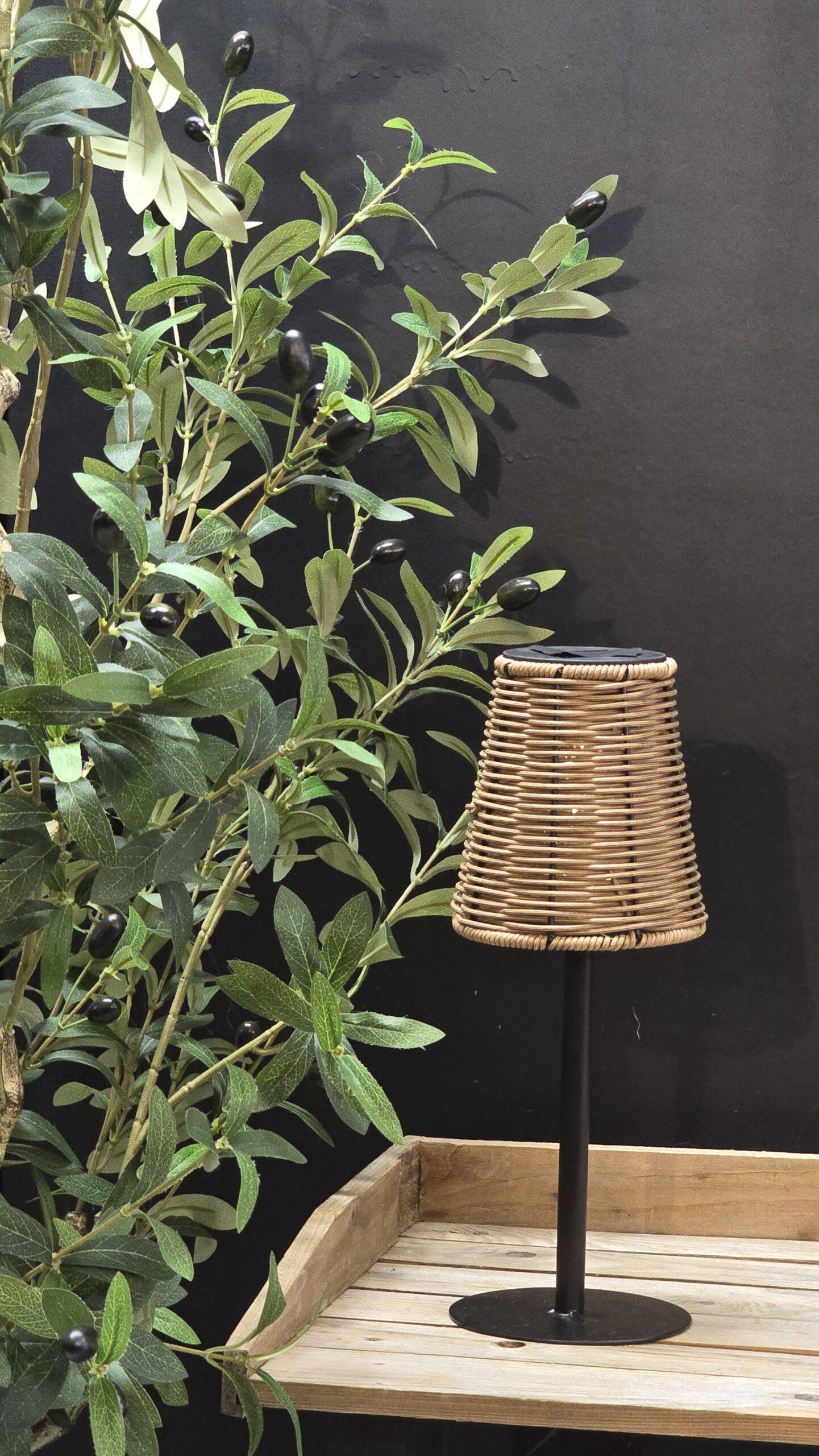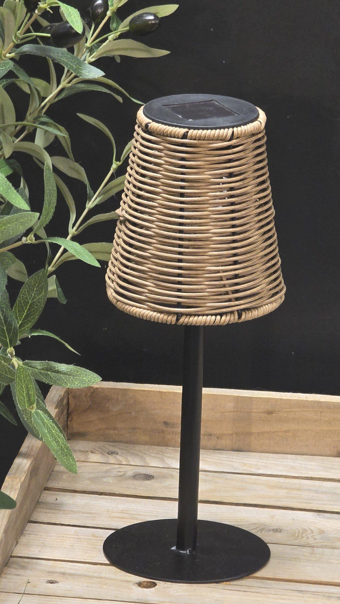 Strakke solar tafellamp met rattan look voor binnen en buiten.