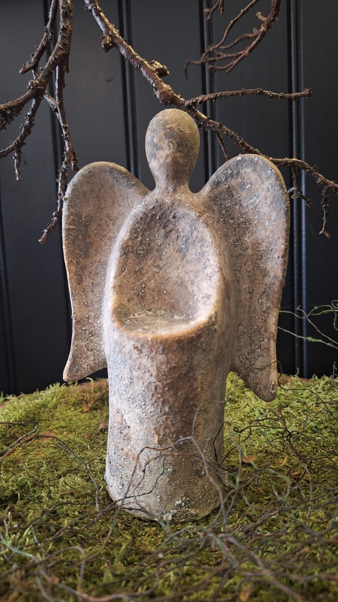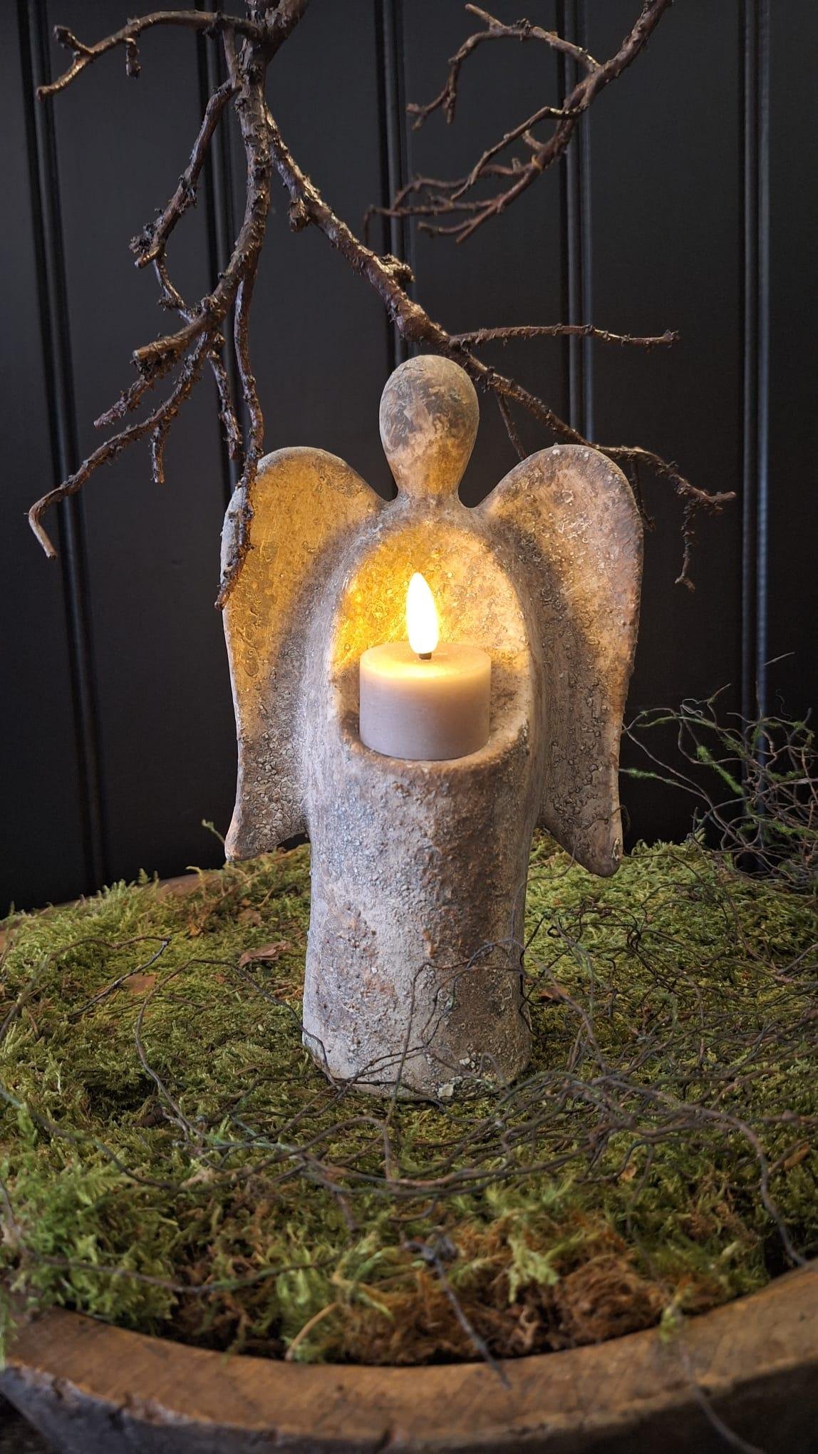 Zet de engel solitair neer als blikvanger, of combineer met andere kaarshouders, mosdecoratie of houten schalen voor een warme landelijke sfeer. Door de neutrale kleurstelling is de theelicht engel makkelijk te combineren met andere accessoires in huis.
