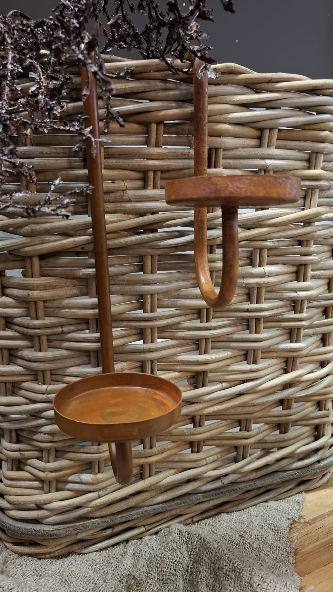 Stoere, robuuste theelichthaak in roestkleurig metaal. Perfect voor sfeervolle wanddecoratie binnen of buiten.