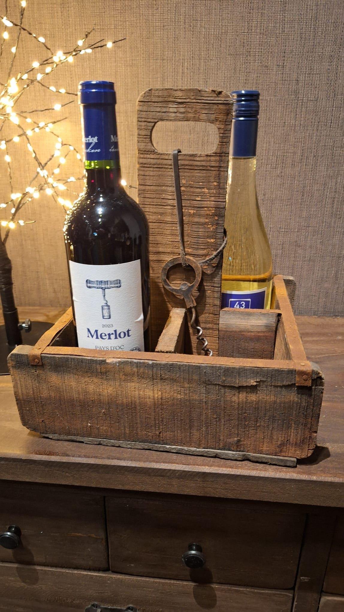 Houten steenmal flessenhouder, voor 4 wijnflessen incl kurkentrekker.