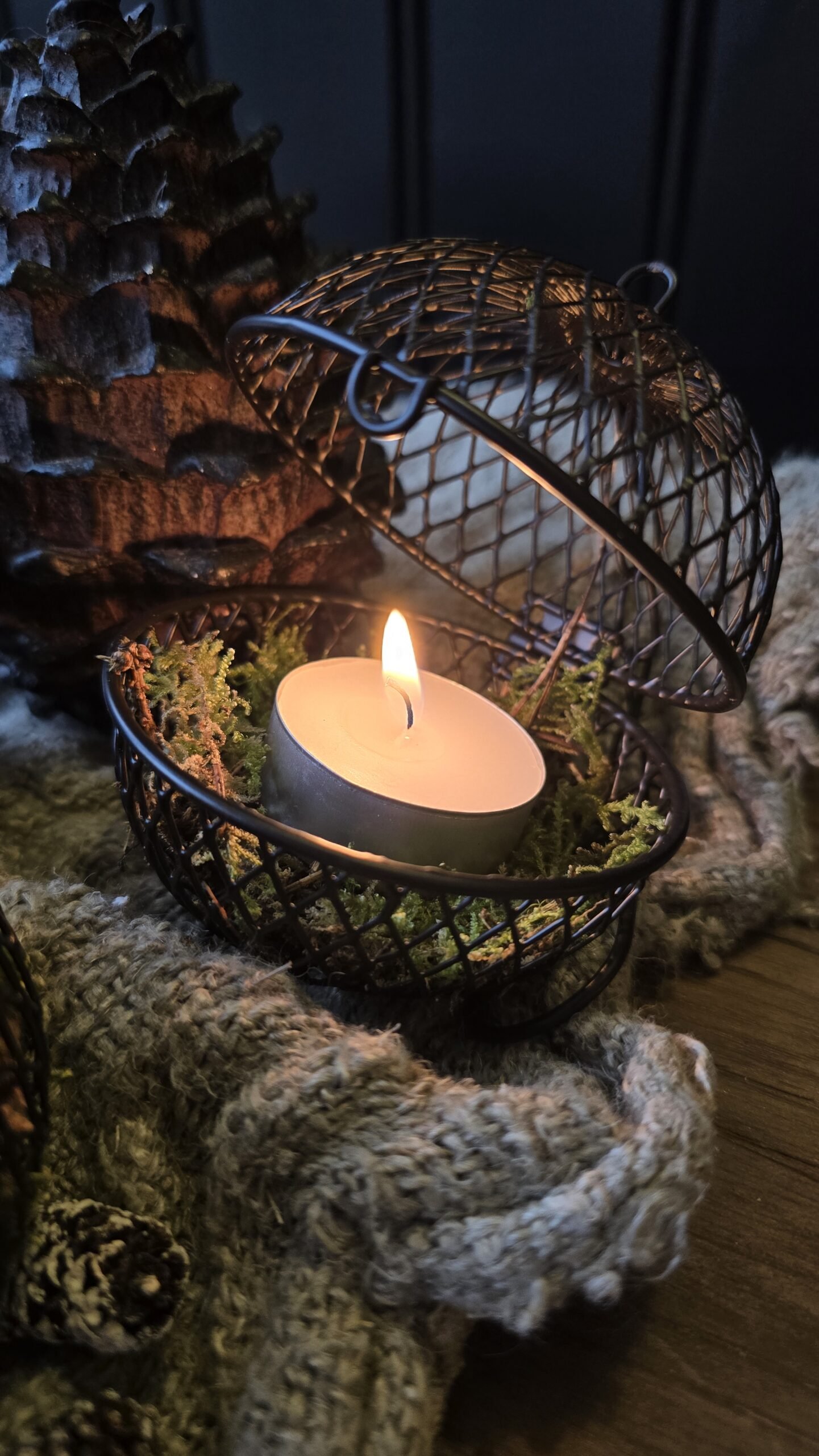 Zwarte Metalen Gaas Hanger met Waxinelichtje en Mos – Perfect voor Binnen en Buiten in Landelijke Stijl